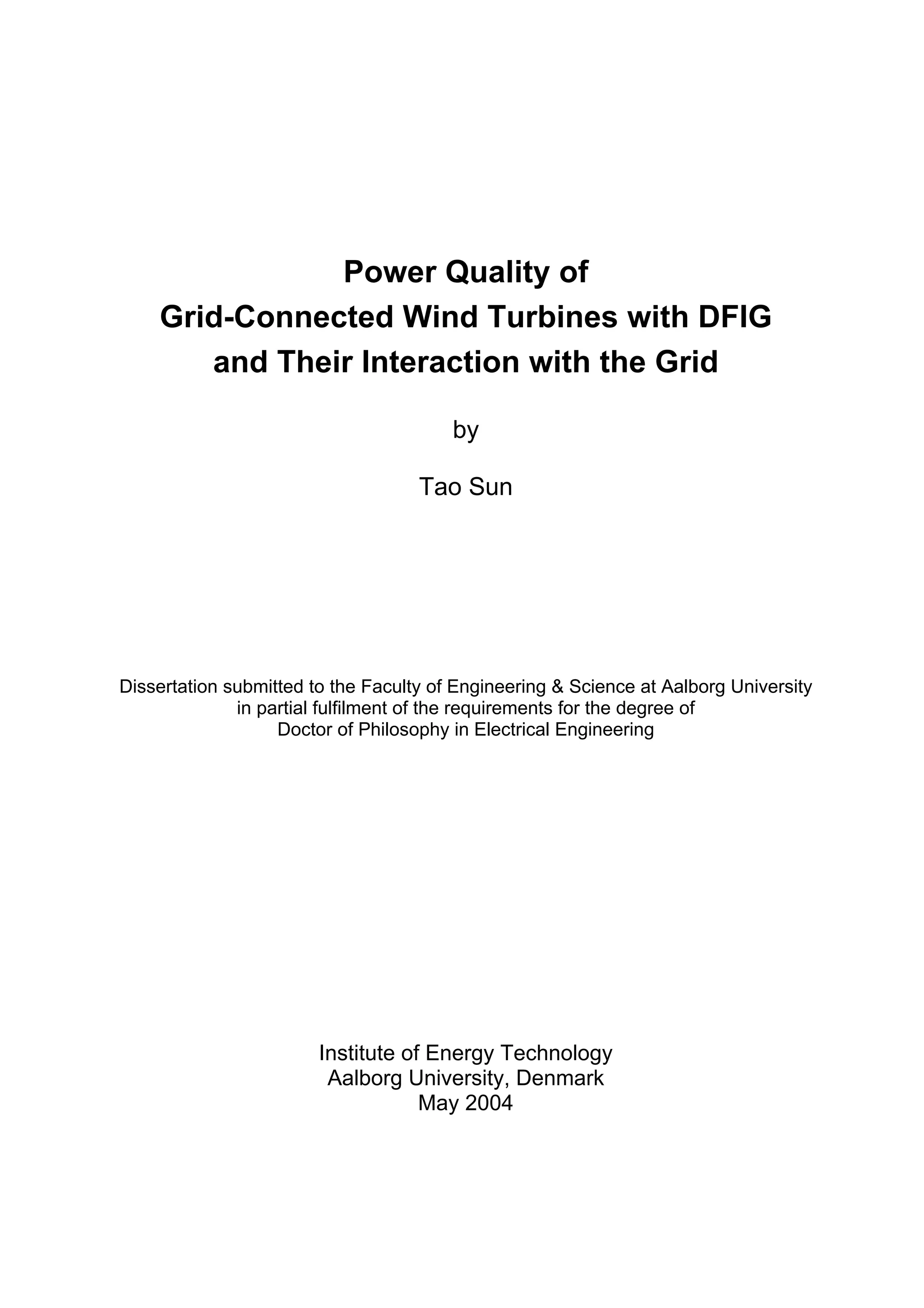This document is a dissertation submitted by Tao Sun to Aalborg University in partial fulfillment of the requirements for a Ph.D. in Electrical Engineering. The dissertation examines power quality issues and interaction between grid-connected wind turbines with doubly fed induction generators and the power grid. It develops models of the wind turbine system and control schemes in the simulation tool PSCAD/EMTDC. It then studies flicker emission during operation and voltage recovery after grid faults to evaluate power quality.