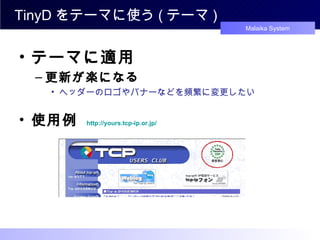 テーマ ) テーマに適用 更新が楽になる ヘッダーのロゴやバナーなどを頻繁に変更したい 使用例 http://yours.tcp-ip.or.jp/