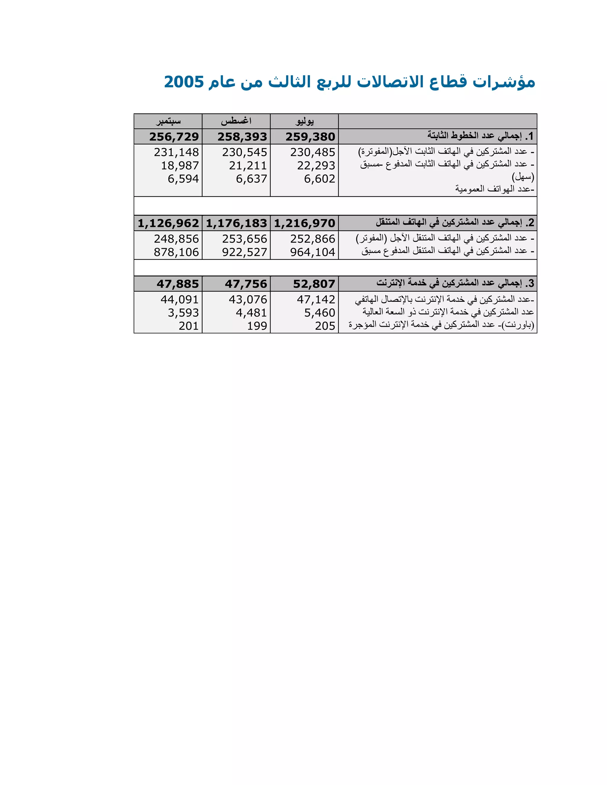 تشير المؤشرات إلى اتجاهات في قطاع الاتصالات خلال الربع الثالث من عام 2025، حيث بلغ إجمالي عدد المشتركين في الخطوط الثابتة 527,652. وارتفع عدد المشتركين في الهواتف المحمولة إلى 9,957,275، بينما بلغ عدد مشتركي خدمات الإنترنت 33,514. تتوزع الأرقام على فئات مختلفة من الخدمات المدفوعة مسبقًا والمفوترة.