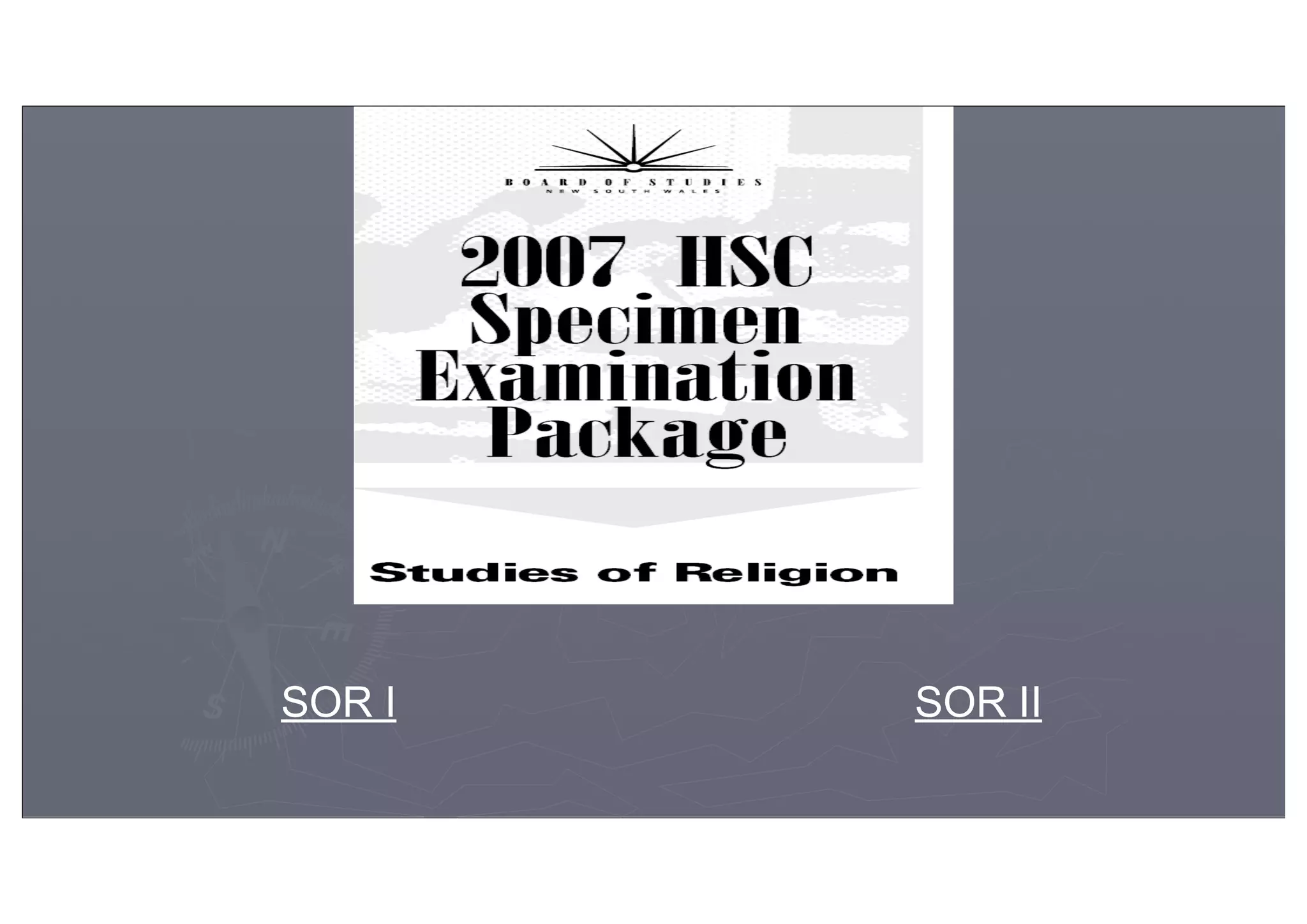 The document provides specifications for the Studies of Religion I and II external HSC examinations. It outlines the structure and format of the exam, including sections on religion and belief systems in Australia (Section I), religious tradition depth studies (Sections II and III), and religion and peace (Section IV, SOR II only). It notes changes to the exam format in 2010, including no maximum marks per part in Section II and expected response lengths. The document emphasizes knowing the syllabus areas and developing a comprehensive understanding of religious traditions and their impact on adherents' lives.