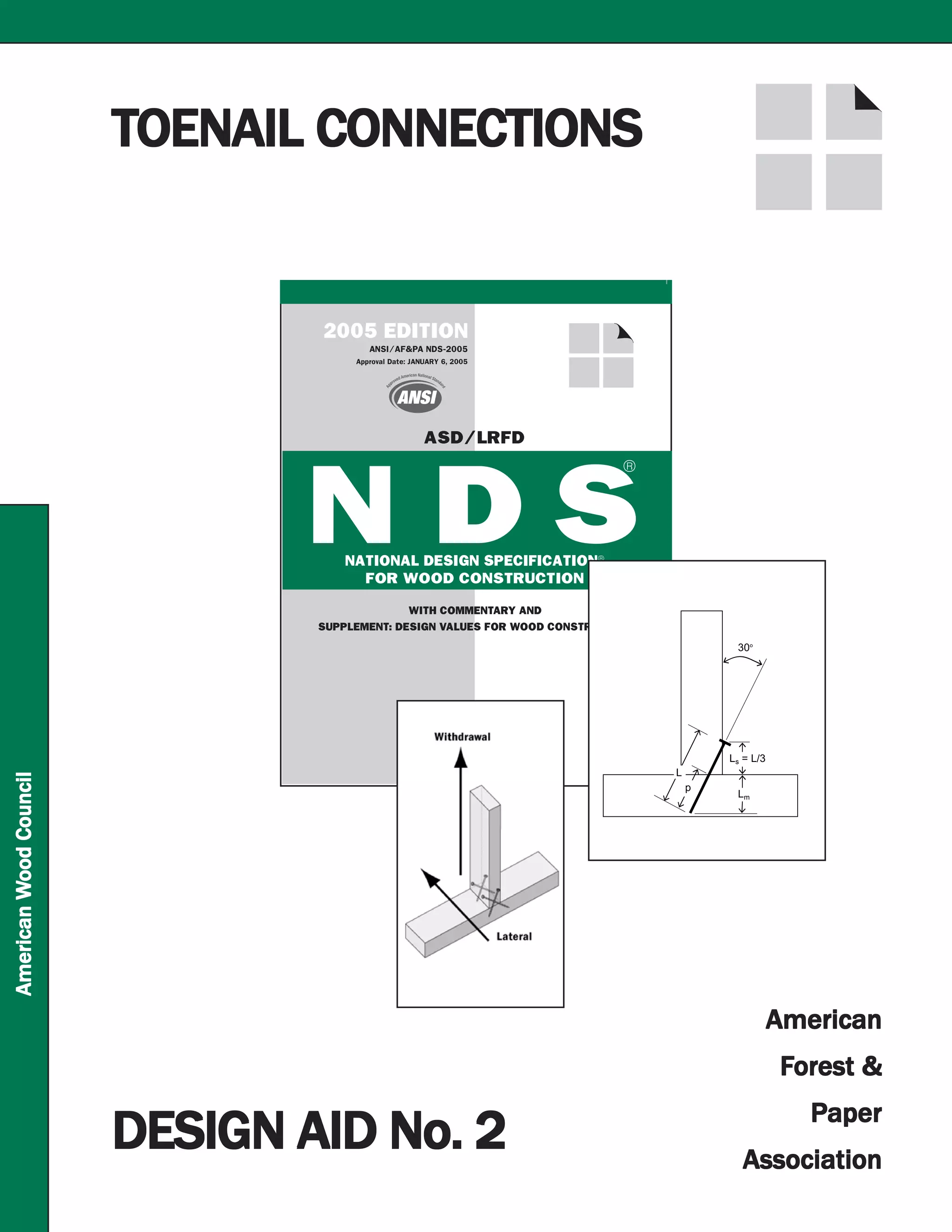 The document is the 2005 edition of the National Design Specification for Wood Construction published by the American Wood Council and American Forest & Paper Association. It provides design values and guidance for wood structural design and connections. Tables in the document provide withdrawal and lateral design values for toe-nailed wood connections based on nail type, diameter, length, wood species and specific gravity values. The values are adjusted factors outlined in the NDS and assume complete nail embedment.