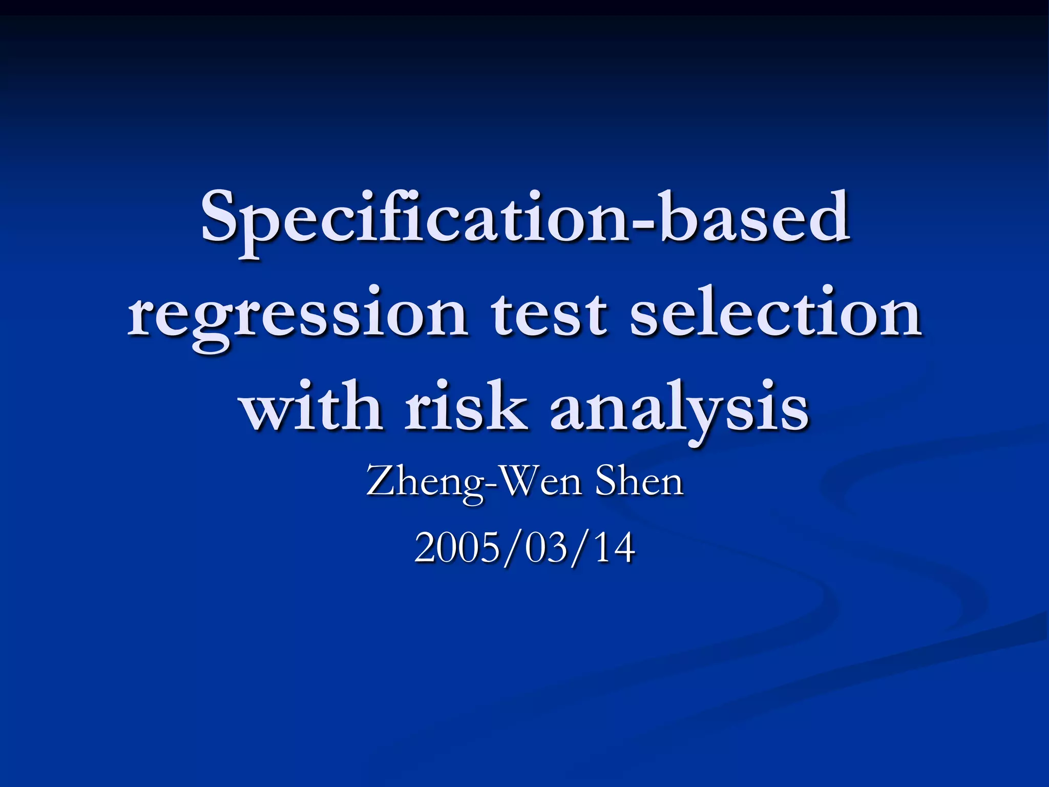 This document describes a specification-based regression test selection technique with risk analysis. It selects targeted tests to cover changes in code or specifications, and safety tests directed by risk analysis. Safety tests are chosen using a risk exposure model factoring probability and cost of faults. Scenarios simulating user profiles are also selected based on their risk exposure covering critical test cases. The approach was evaluated on an IBM project and found effective, cost-efficient, and sensitive to risk. Future work includes determining when to stop testing and implementing the approach in a production environment.