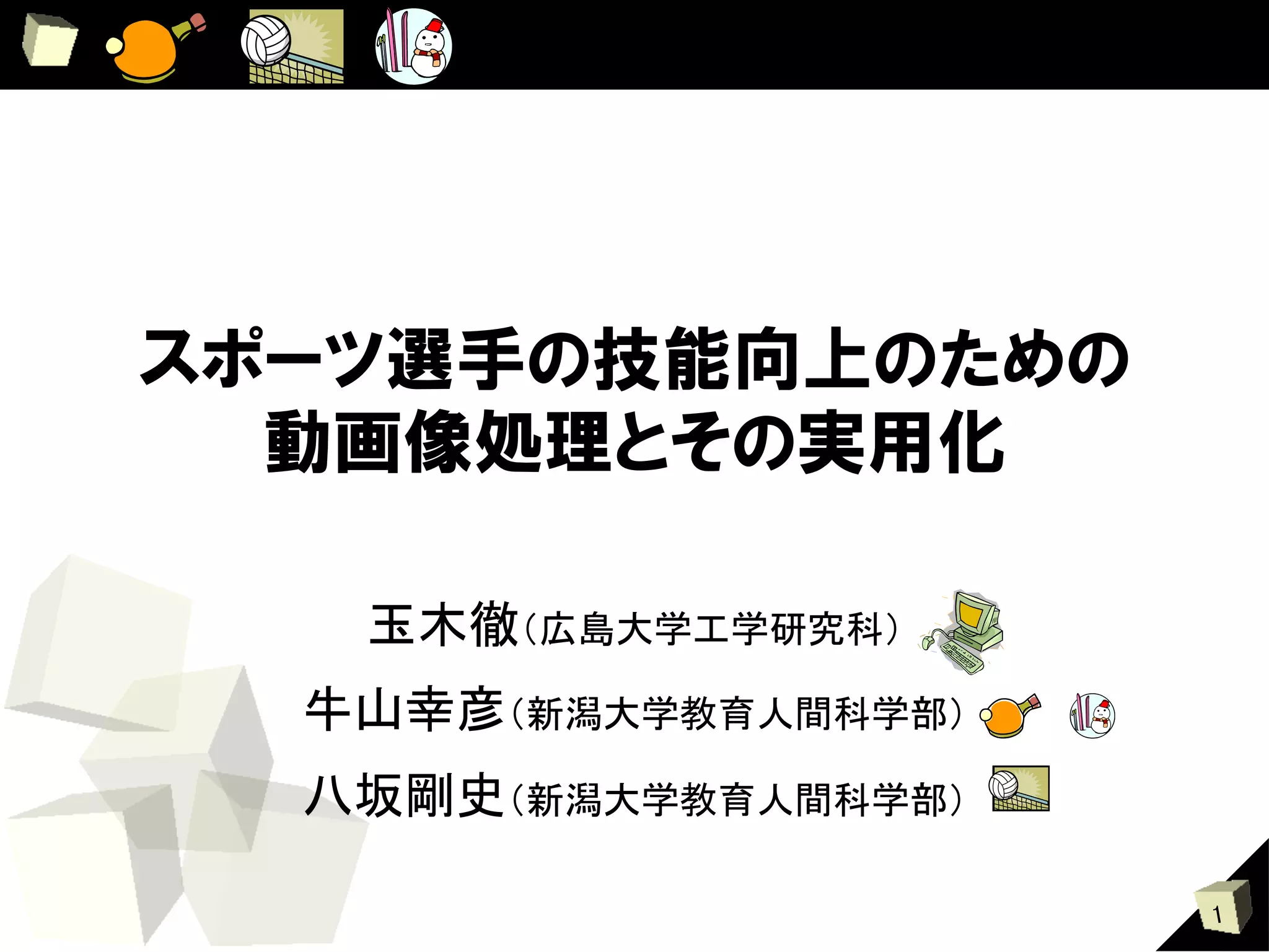 玉木徹, 牛山幸彦, 八坂剛史 : 「スポーツ選手の技能向上のための動画像処理とその実用化」, 電子情報通信学会技術報告 パターン認識・メディア理解研究会 PRMU2005-116, No.116, pp.13-18, 広島市立大学, 広島 (2005 11).