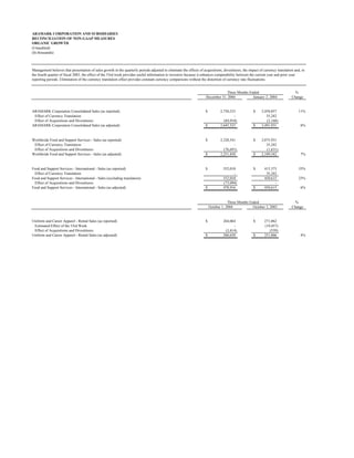 The document provides a reconciliation of non-GAAP measures and organic growth for ARAMARK Corporation and its subsidiaries. It summarizes sales growth for the company and its divisions in the fourth quarter of 2004 and 2003 adjusted to eliminate the effects of acquisitions, divestitures, currency translation, and the 53rd week in 2003. Overall consolidated sales grew 6% organically. Worldwide food and support services sales grew 7% organically and food and support services international sales grew 6% organically. Uniform and career apparel rental sales grew 4% organically.