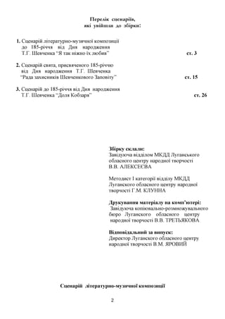 This document summarizes three screenplays submitted for the 185th anniversary of Taras Shevchenko's birth. The screenplays include: 1) A literary-musical composition about Shevchenko's poem "I Love You So Dearly"; 2) A screenplay about the wedding of Shevchenko's protectors; and 3) A screenplay about Shevchenko's poem "Kozak Hetman". The screenplays were selected by the head of the Luhansk Regional Folk Creativity Center.