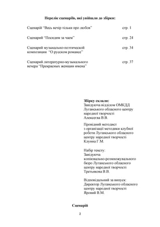 This document contains the program for an event held by the Luhansk Regional House of Folk Art. It includes 4 scenes: "The Whole Evening Only About Love", "The Last Guest", a musical-poetic composition "About Russian Romances", and a literature-music evening "The Beautiful Names of Women". It lists the organizers and compilers of the program. Several poems are included that discuss themes of love, springtime, and nature.