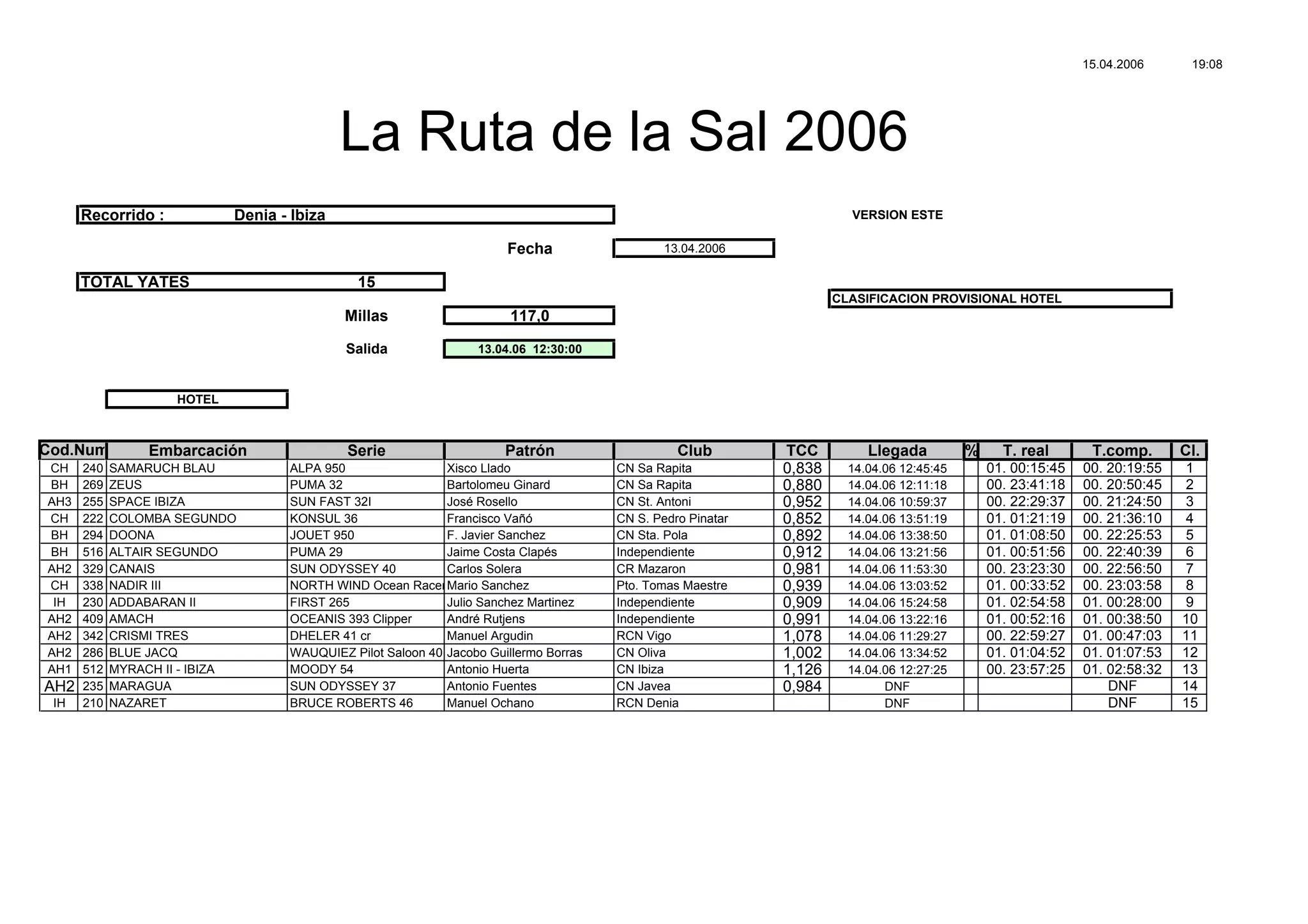 This document summarizes the results of a yacht race from Denia to Ibiza on April 13, 2006 with 15 participating yachts. It lists each yacht's name, type, captain, club affiliation, arrival time, percentage of actual vs expected time, and final classification. The top three finishers were the yachts AH3, CH 222, and BH 269 which arrived at 10:59 AM, 13:51 PM, and 12:11 PM respectively, all coming in under their estimated times.