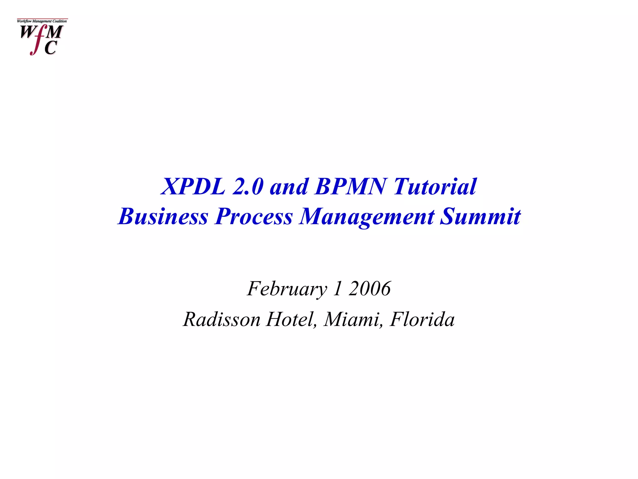 The document discusses the XPDL 2.0 and BPMN tutorial presented at the Business Process Management Summit in February 2006, outlining the roles of key speakers and the agenda topics. It explains the origins, uses, and enhancements of XPDL and BPMN, including conformance requirements for both languages. Additionally, it highlights the relationships between them and makes reference to various organizations supporting these standards.