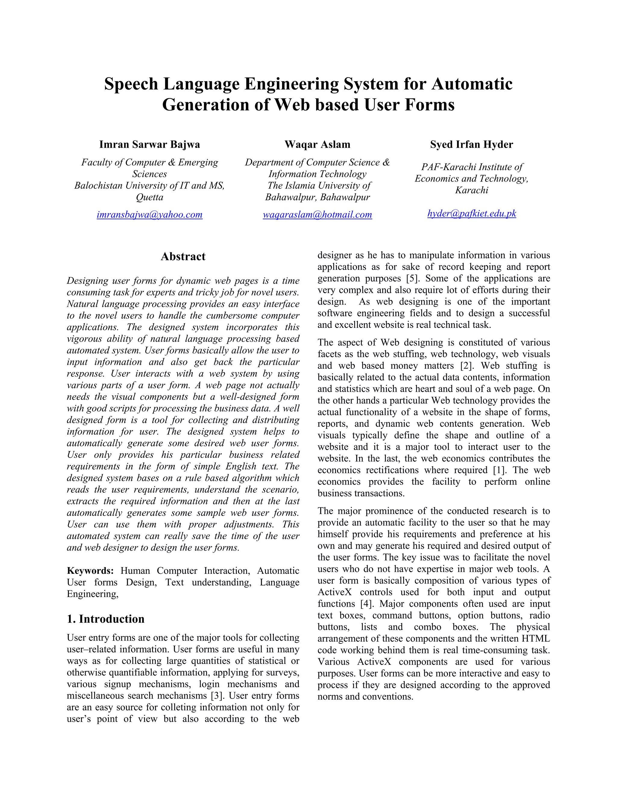 The document discusses the development of a speech language engineering system designed for the automatic generation of web-based user forms, which aims to simplify the process for users lacking expertise in web design. By utilizing a rule-based algorithm, the system processes user input in simple English to extract relevant information and generate corresponding HTML forms automatically. This research contributes to improving user interaction and efficiency in web form design, particularly for novice users in need of assistance.