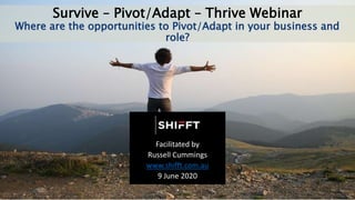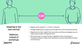 The webinar provided guidance to business leaders on pivoting and adapting their businesses during the COVID-19 crisis. It outlined a three-phase model of surviving, pivoting/adapting, and thriving. Participants learned tools for conducting competitor analyses and reworking their product offerings. They worked in breakout groups to apply these tools and get feedback. The webinar emphasized the need for ongoing review of market trends and strategies as restrictions are lifted and businesses look to recover and capitalize on opportunities from what they've learned.