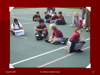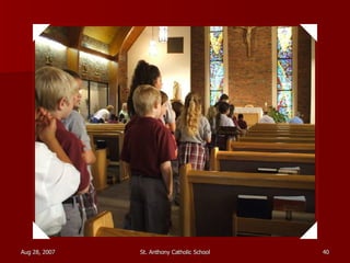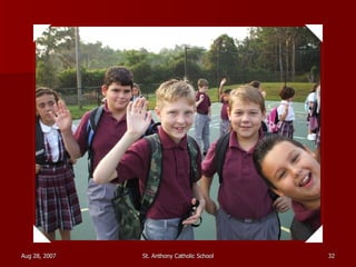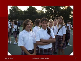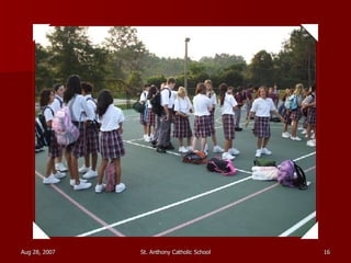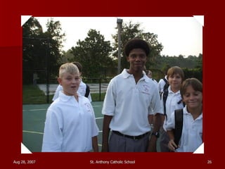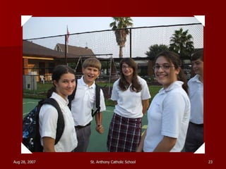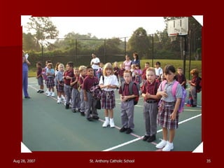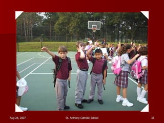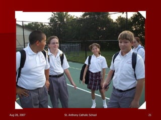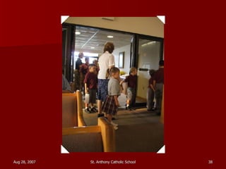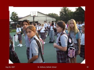 St. Anthony Catholic School welcomed students back for the first day of the 2007 school year. Students were excited to see their friends and meet their new teachers after a long summer break. The principal, Mrs. Smith, greeted students and families at the front entrance and reminded everyone that it will be another great year of learning and faith at St. Anthony.