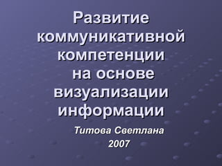 Документ обсуждает развитие коммуникативной компетенции через визуализацию информации в обучении, подчеркивая важность визуальных средств в восприятии и понимании учебного материала. Основное внимание уделяется методам и подходам к использованию мультимедийных материалов для улучшения усвоения социокультурной информации. Описаны этапы восприятия информации и преимущества визуализации, такие как ускорение обработки и усвоения учебного контента.