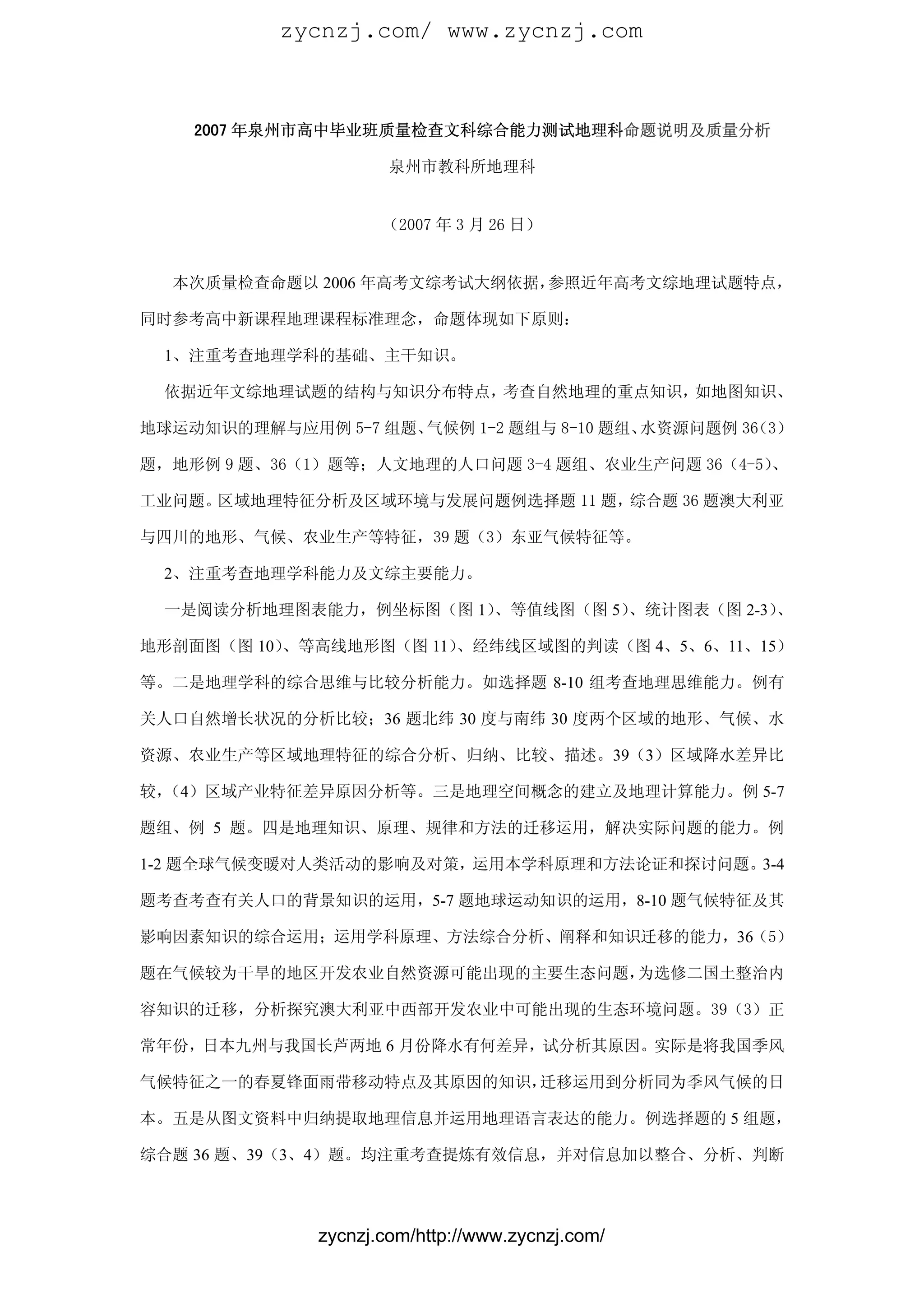 本文件分析了泉州市2007年高中地理科质量检查的命题原则和考查内容,强调了基础知识、能力和实际问题探究的重要性。同时指出了学生在答题中存在的理解不足和审题能力下降等问题,并提出了针对性的复习策略,以提高学生的地理知识运用能力和综合思维能力。