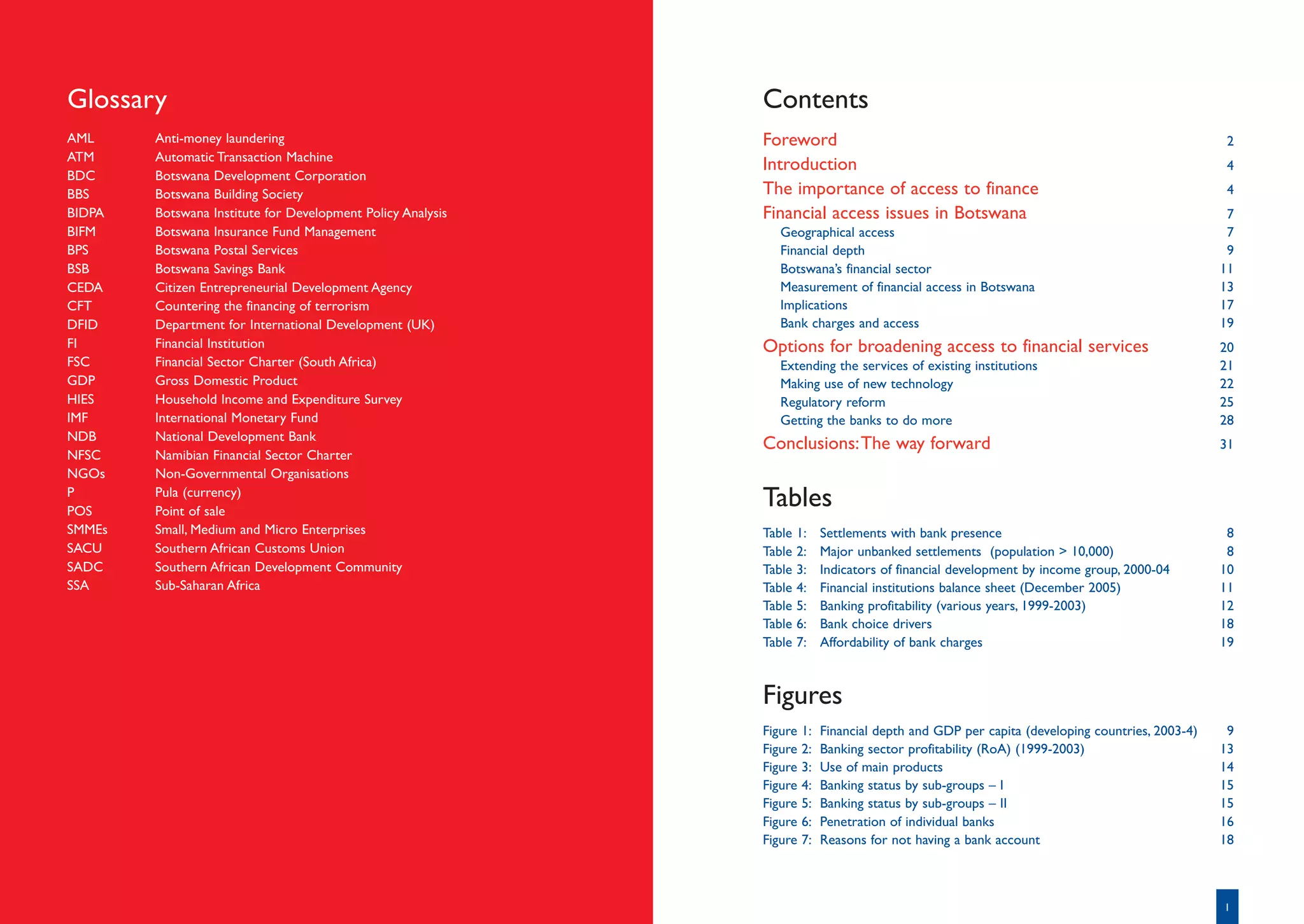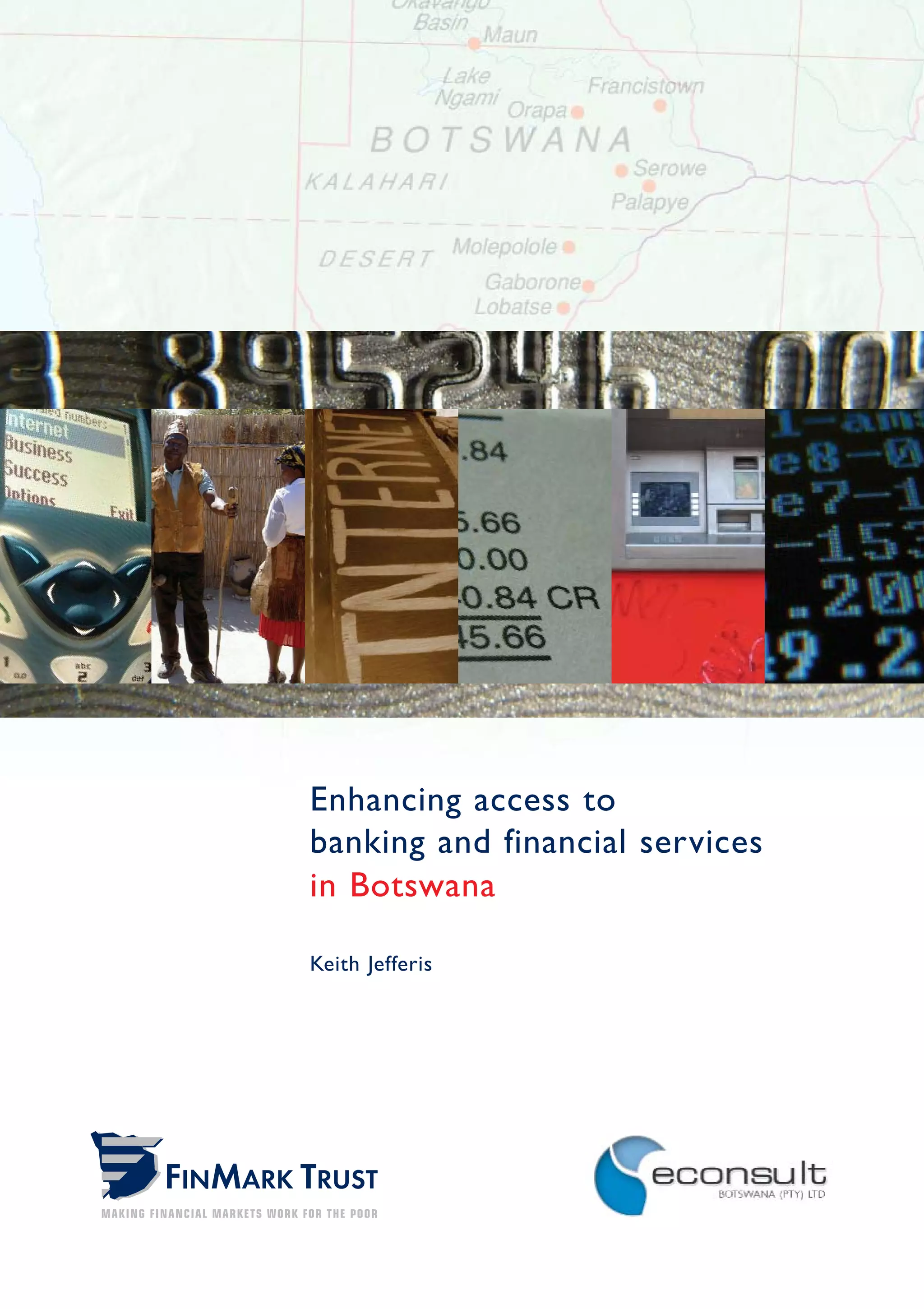 Financial access issues in Botswana are examined. Over half of Botswana's adult population does not use banking services. While Botswana's financial sector development exceeds regional averages, challenges remain in ensuring greater participation in banking, especially among lower-income groups. Options to broaden access include extending the reach of existing institutions, utilizing new technologies, regulatory reforms, and encouraging banks to expand their customer base.