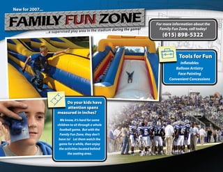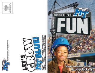 This document provides information about group ticket packages and activities for families at Middle Tennessee State University Blue Raiders football games. It describes a Family Fun Zone that provides supervised activities for kids behind the stadium seating during games. Various group ticket packages are listed, including opportunities to participate in pre-game rituals or have a party tent. Contact information is provided to reserve group tickets and packages.