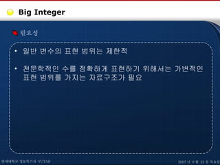 Big Integer 필요성일반 변수의 표현 범위는 제한적 천문학적인 수를 정확하게 표현하기 위해서는 가변적인 표현 범위를 가지는 자료구조가 필요 연세대학교 정보특기자 YUTAR 2007 년 6 월 21 일 목요일
