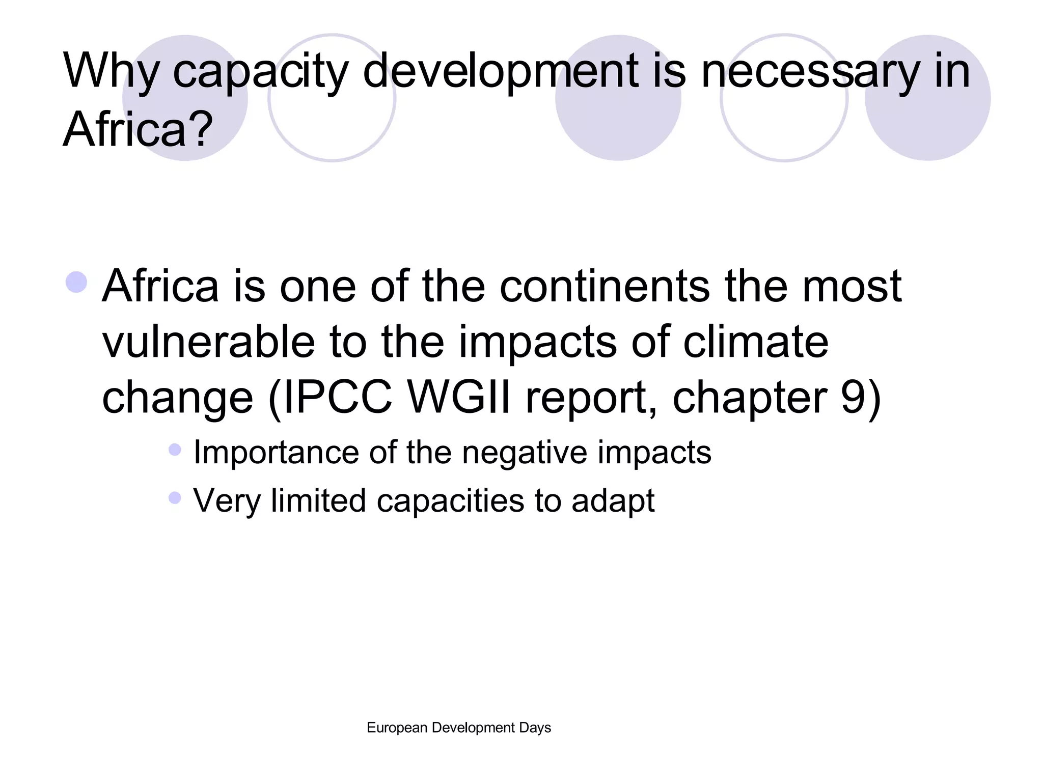 The document discusses the urgent need for capacity development in Africa to address the limitations in adapting to climate change impacts. It highlights the importance of strengthening institutional frameworks, enhancing research capabilities, and empowering local communities to improve adaptive capacities. Recommendations include increasing funding, supporting local decision makers, and promoting knowledge exchange to integrate climate change risks into sustainable development plans.