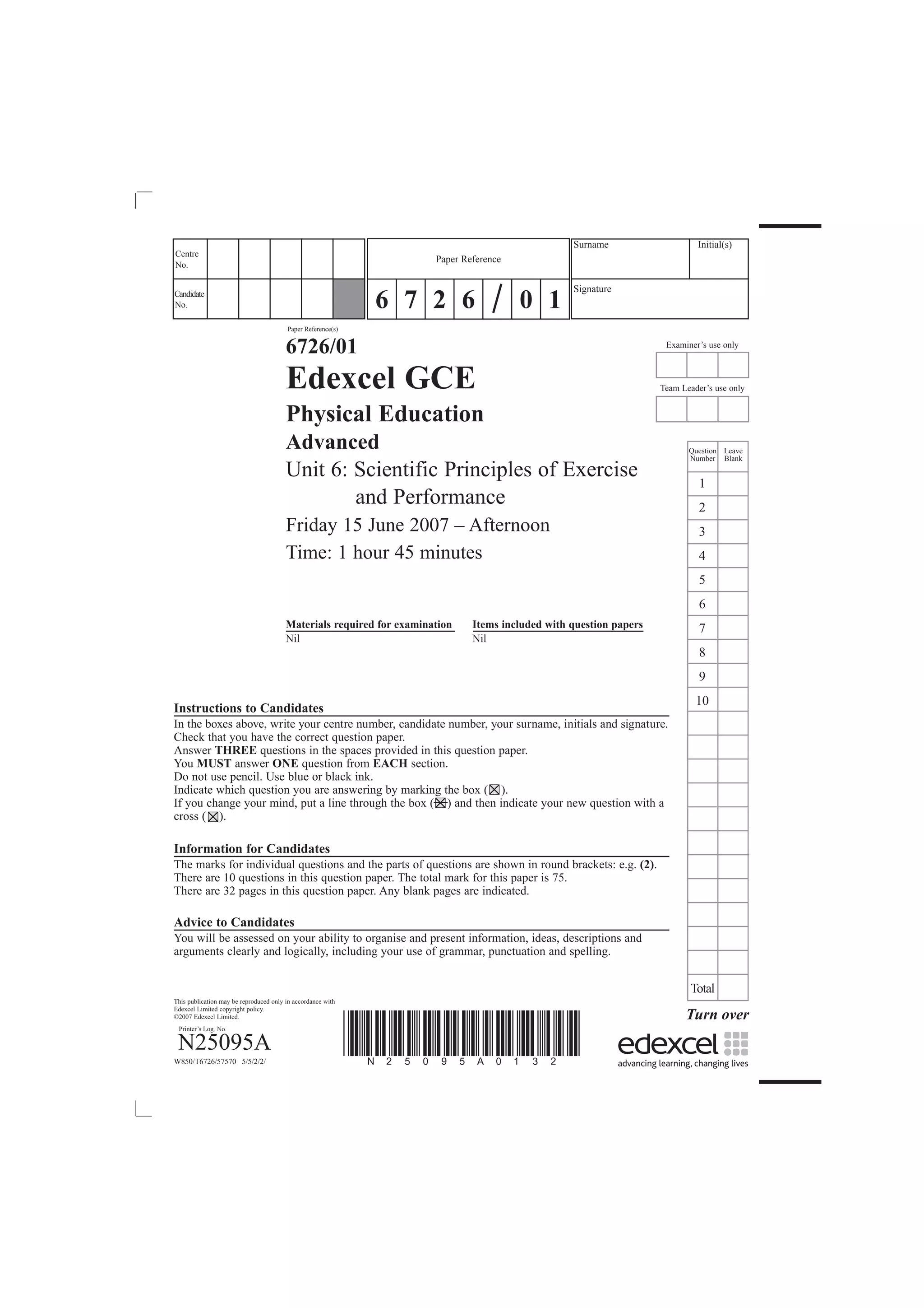 This document appears to be an exam paper for a Physical Education course. It provides instructions for candidates on how to fill out personal information, which questions to answer, formatting, and other guidelines. The first section is about exercise and energy systems and contains two questions for candidates to choose from and answer in the provided spaces.