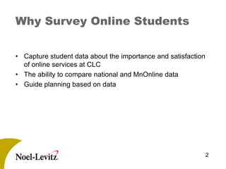 This document summarizes the results of an online student satisfaction survey conducted at Central Lakes College (CLC) in 2007. Some key findings include: 1. Strengths identified were the reliability of the online delivery platform (D2L), convenient registration for online courses, and useful information available on the CLC website. 2. Challenges included the quality of online instruction, responsiveness of faculty, adequate financial aid availability, and timely service from the bookstore. 3. Recommendations were made to celebrate strengths, address challenges through initiatives and focus groups, and communicate actions back to students.