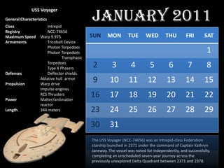The document provides details on several Federation starships from January to June 2011, including the USS Voyager, USS Prometheus, USS Enterprise E, USS Enterprise D, USS Enterprise C, and USS Defiant. It describes the class, registry number, maximum speed, armaments, defenses, propulsion, power, and length of each ship. The USS Voyager is noted for its unscheduled seven-year journey across the Delta Quadrant between 2371 and 2378.