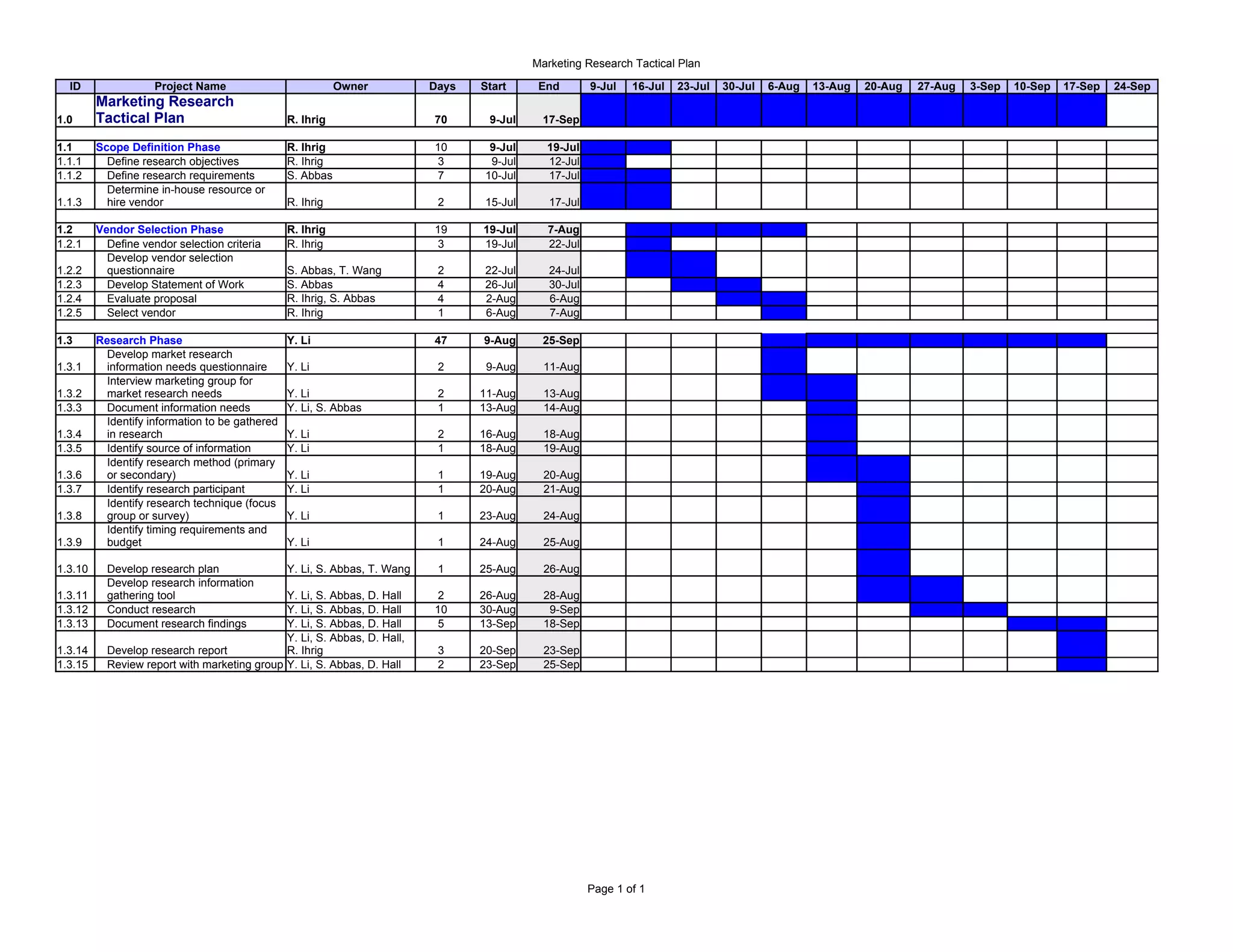 The document outlines a marketing research tactical plan that will take place over 70 days from July 9th to September 17th. It involves three main phases - a scope definition phase to outline research objectives and requirements, a vendor selection phase if external resources are required, and a research phase to develop and conduct the research. The research phase activities include developing questionnaires, identifying information needs, research methods and participants, conducting the research, analyzing findings, and developing a final research report to review with the marketing group.