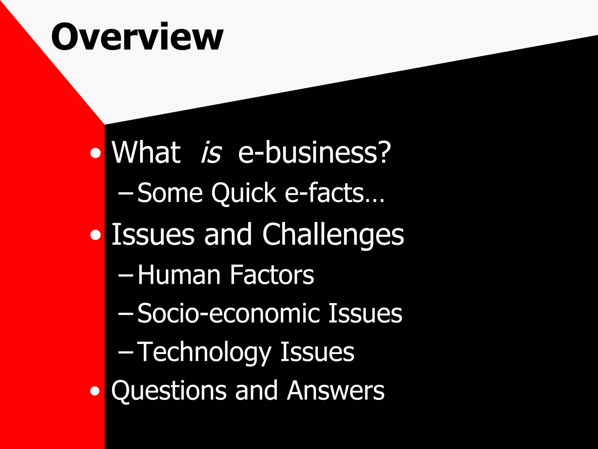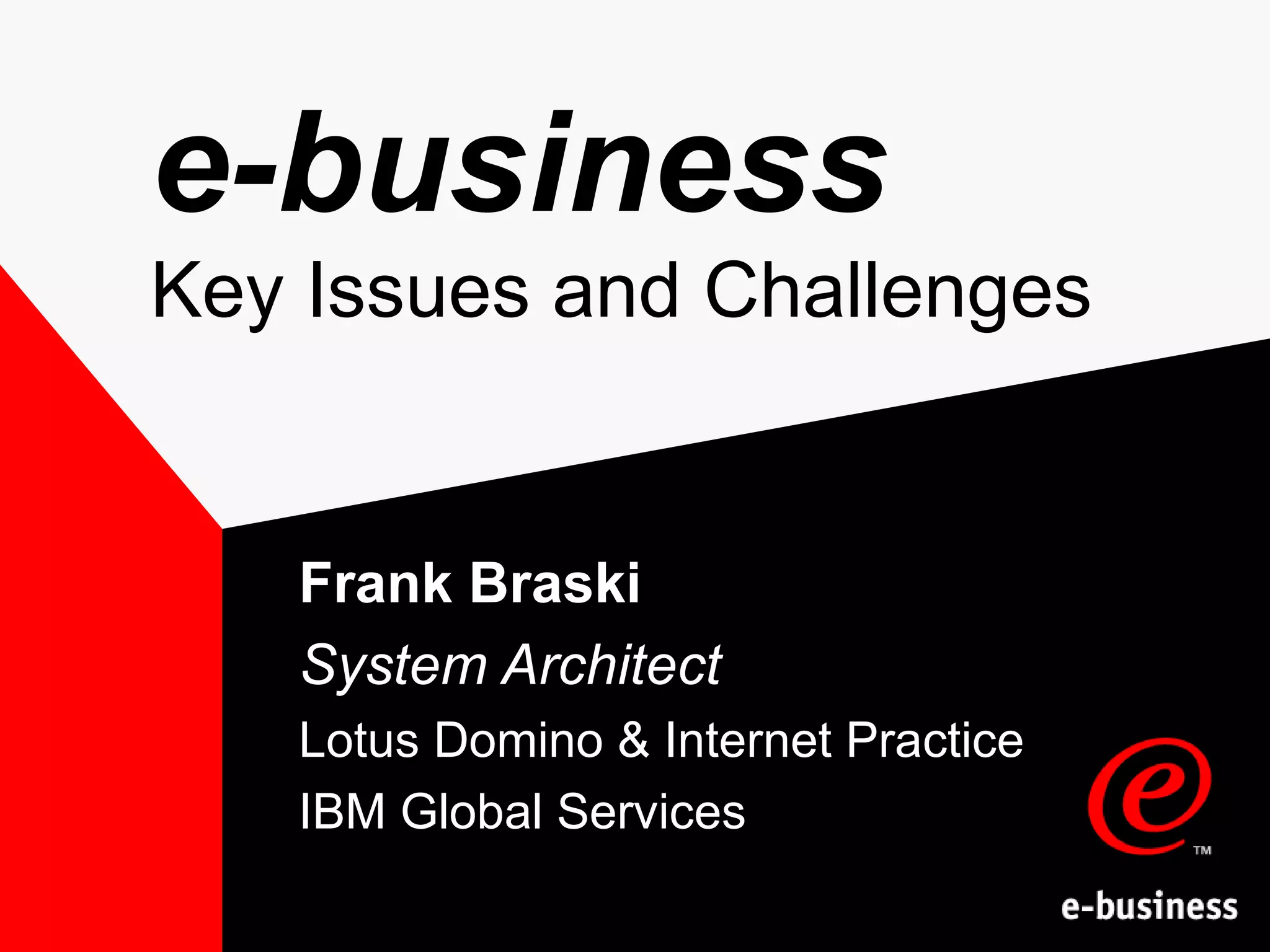 The document discusses the key issues and challenges in e-business, highlighting its growth potential, customer service demands, and the socio-economic factors affecting consumer behavior. It outlines the technological issues related to security, accountability, scalability, and integration that businesses must address. Furthermore, it emphasizes the shift in traditional business models and the need for adaptation in the online environment.