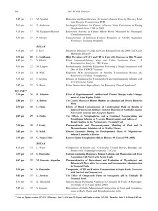 This document provides an abstract program for the 25th Annual ACVIM Forum held in Seattle, WA from June 6-9, 2007. It lists 99 oral presentations given over the four days, organized by topic area (e.g. oncology, infectious disease, cardiology, etc.). The presentations include research studies on diseases and conditions in small animals, horses, food animals, and topics related to veterinary internal medicine specialties.
