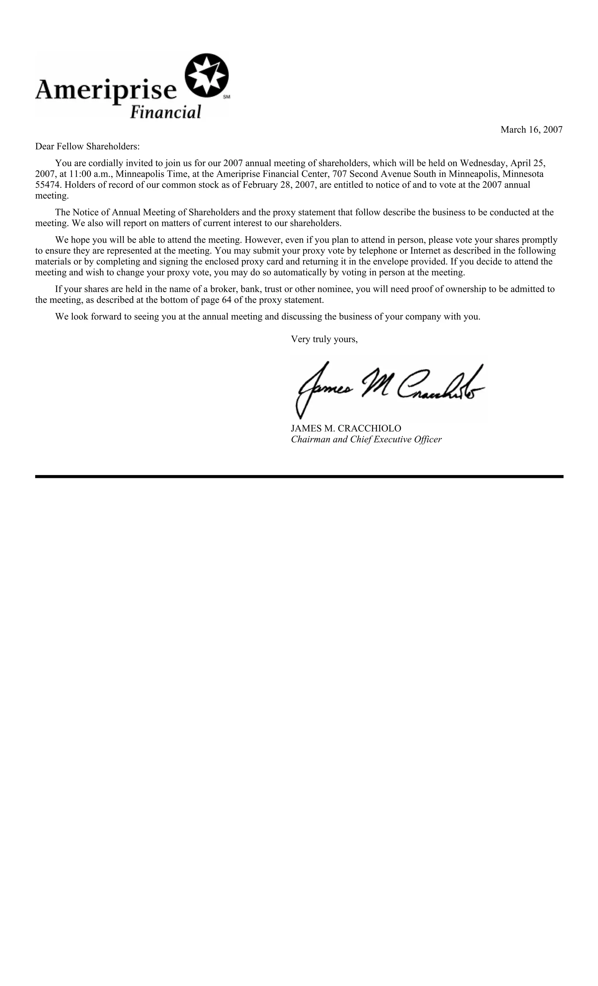 The document is a proxy statement from Ameriprise Financial, Inc. informing shareholders of the upcoming annual meeting on April 25, 2007. It invites shareholders to attend the meeting to vote on four items of business: 1) electing four directors, 2) approving an amended incentive compensation plan, 3) ratifying the selection of Ernst & Young as the independent auditor for 2007, and 4) any other business that may properly come before the meeting. It provides details on shareholder voting eligibility, procedures for voting by proxy, and the required votes to pass each proposal.