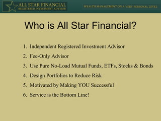 This document provides an overview of All Star Financial, an independent fee-only financial advisory firm. It discusses the firm's services, investment philosophy, and approach to managing client portfolios. Key points include: