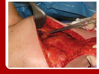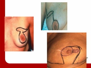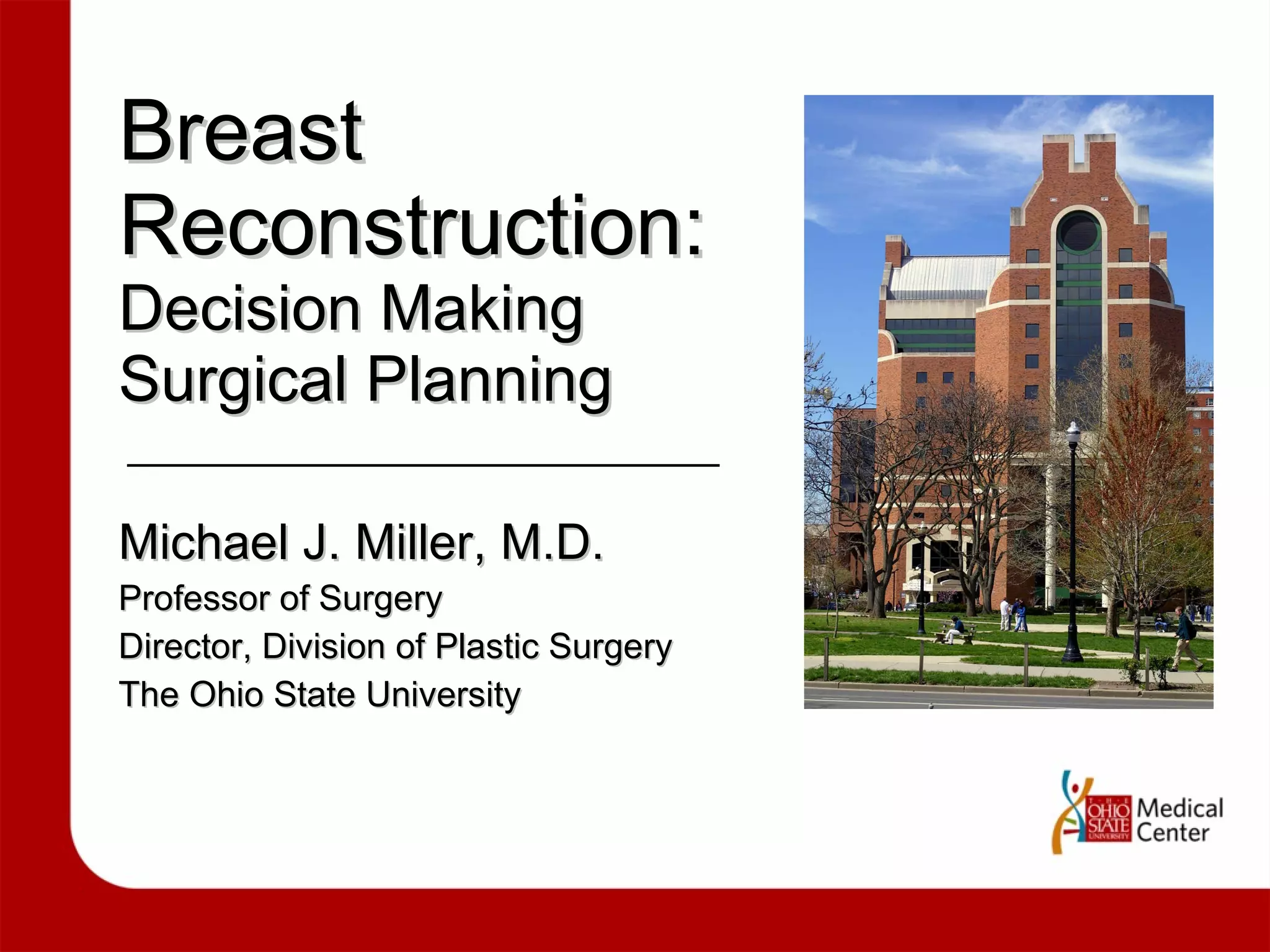 1. The document discusses various options for breast reconstruction after mastectomy, including immediate versus delayed reconstruction and the use of tissue flaps, implants, or a combination.