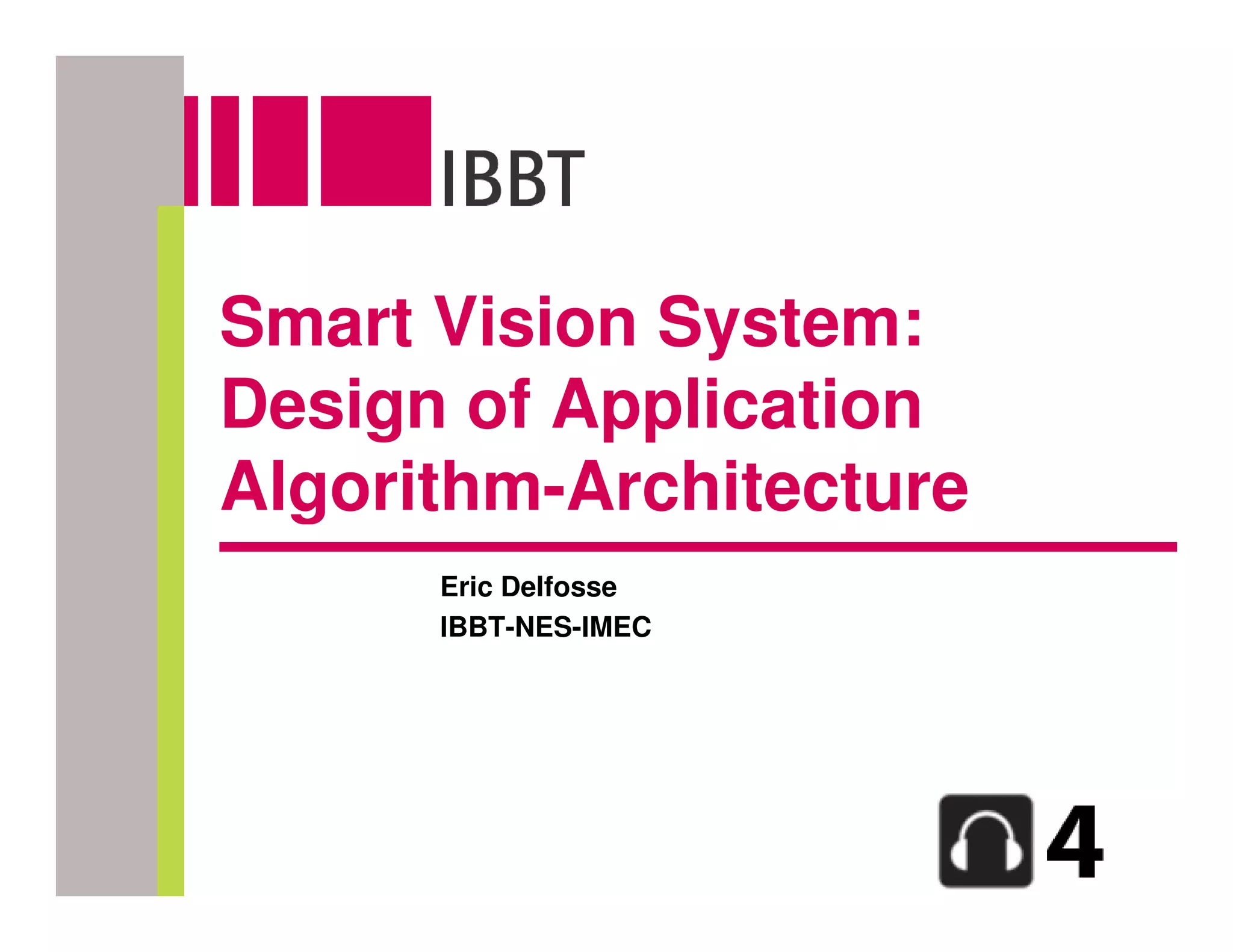 Smart vision systems embed intelligence through advanced image processing to enhance visual experiences, improve interactions, and facilitate decisions for complex events. They require increasingly complex algorithms to perform tasks like 3D reconstruction, gesture recognition, and event detection. These algorithms must be matched to diverse platform architectures with different performance and power constraints. Successful system design requires matching applications, algorithms, and architectures, drawing on competencies in all three areas. The International B-ICT Based Basic Research Centre (IBBT) brings these competencies together to enable new smart vision applications.