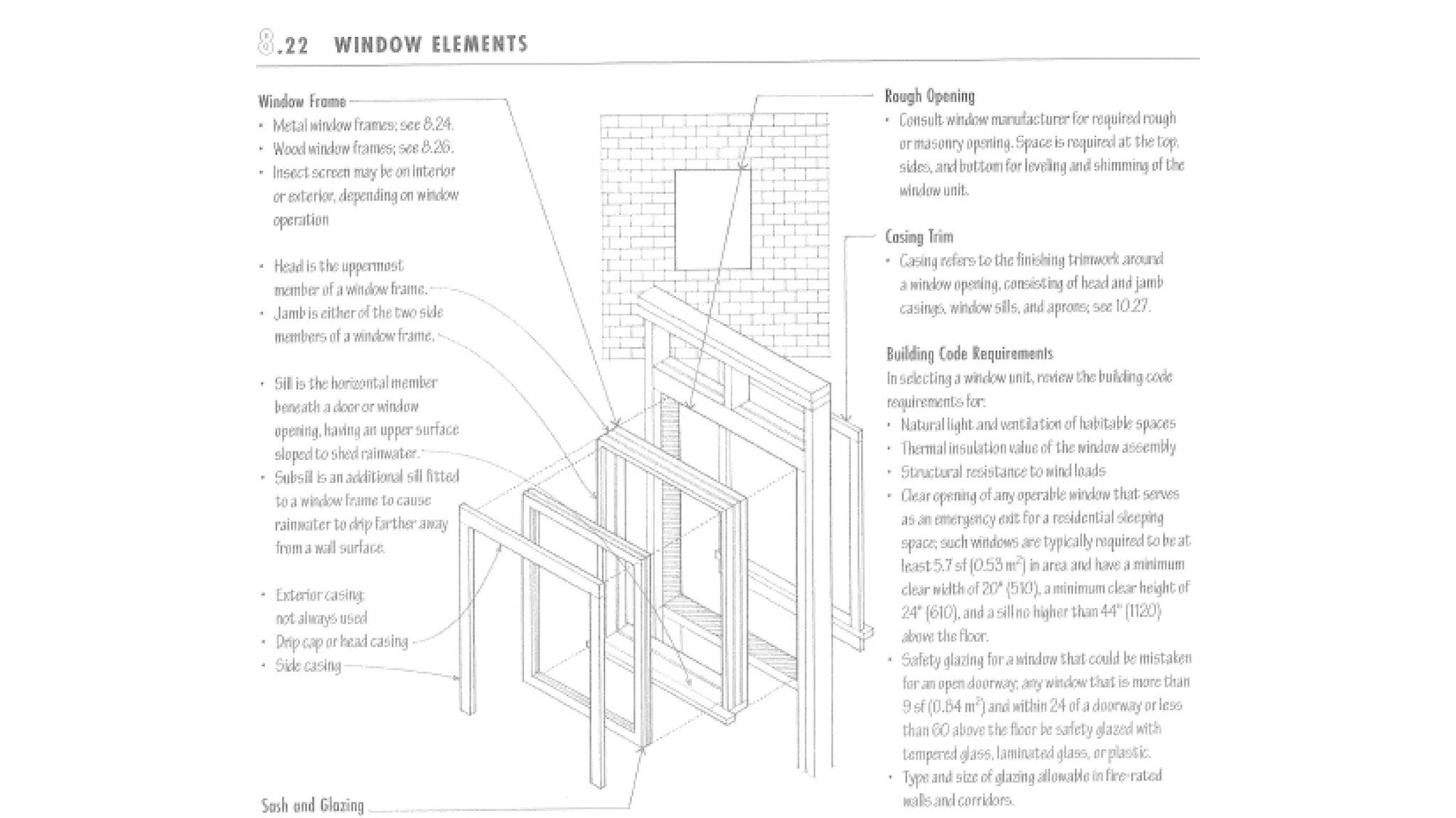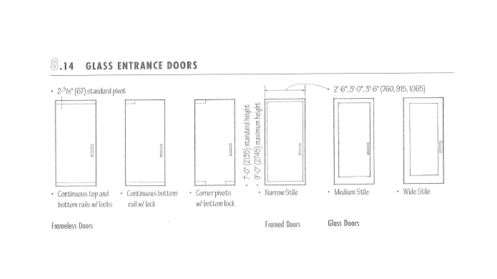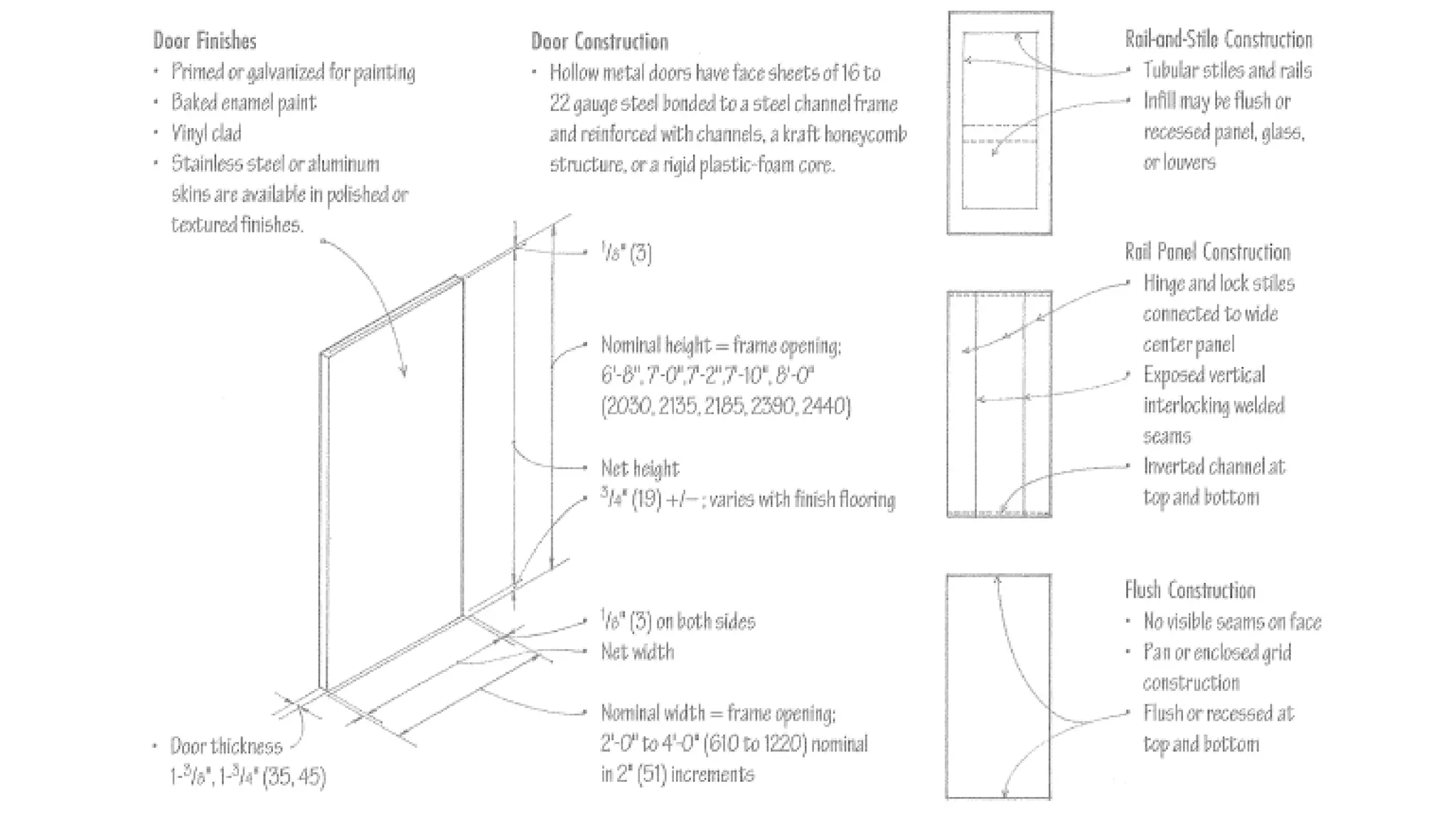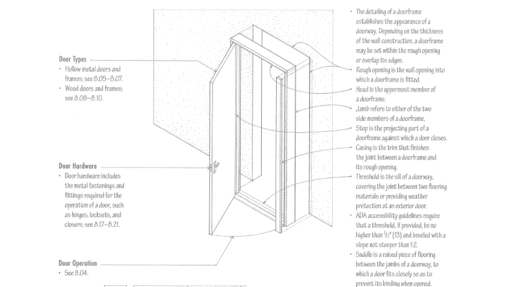 The document outlines various architectural drawing tasks, including plans and elevations for different types of doors and windows. It specifies the need for accessible door maneuvering clearances and requires drawings for hollow metal, wood flush, wood rail & stile, sliding glass, folding, pocket sliding, and revolving doors. Additionally, it calls for drawings of four different window operation types.