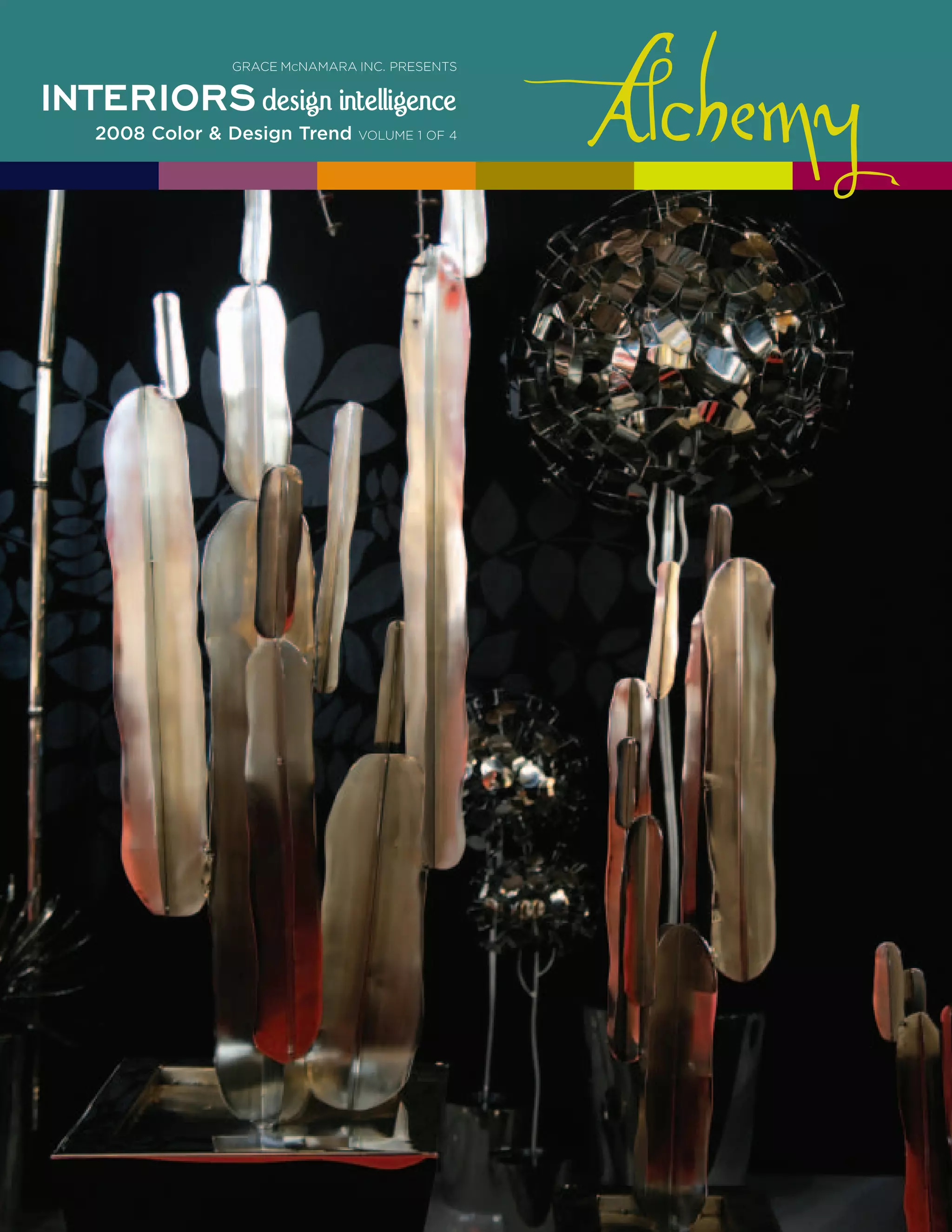 Grace McNamara Inc. presents the 2008 Color & Design Trend, focusing on themes such as alchemy and edenism which emphasize emotional responses, individual luxury experiences, and a blend of historical and contemporary aesthetics. The document outlines three key themes: cabinet of curiosities, chymestry, and renegade craft, alongside evolving color palettes and material trends reflecting a transition from traditional luxury to more personalized and experiential forms. Overall, the trends indicate a shift towards purity of materials and craftsmanship, merging various influences to create distinct, memorable designs.