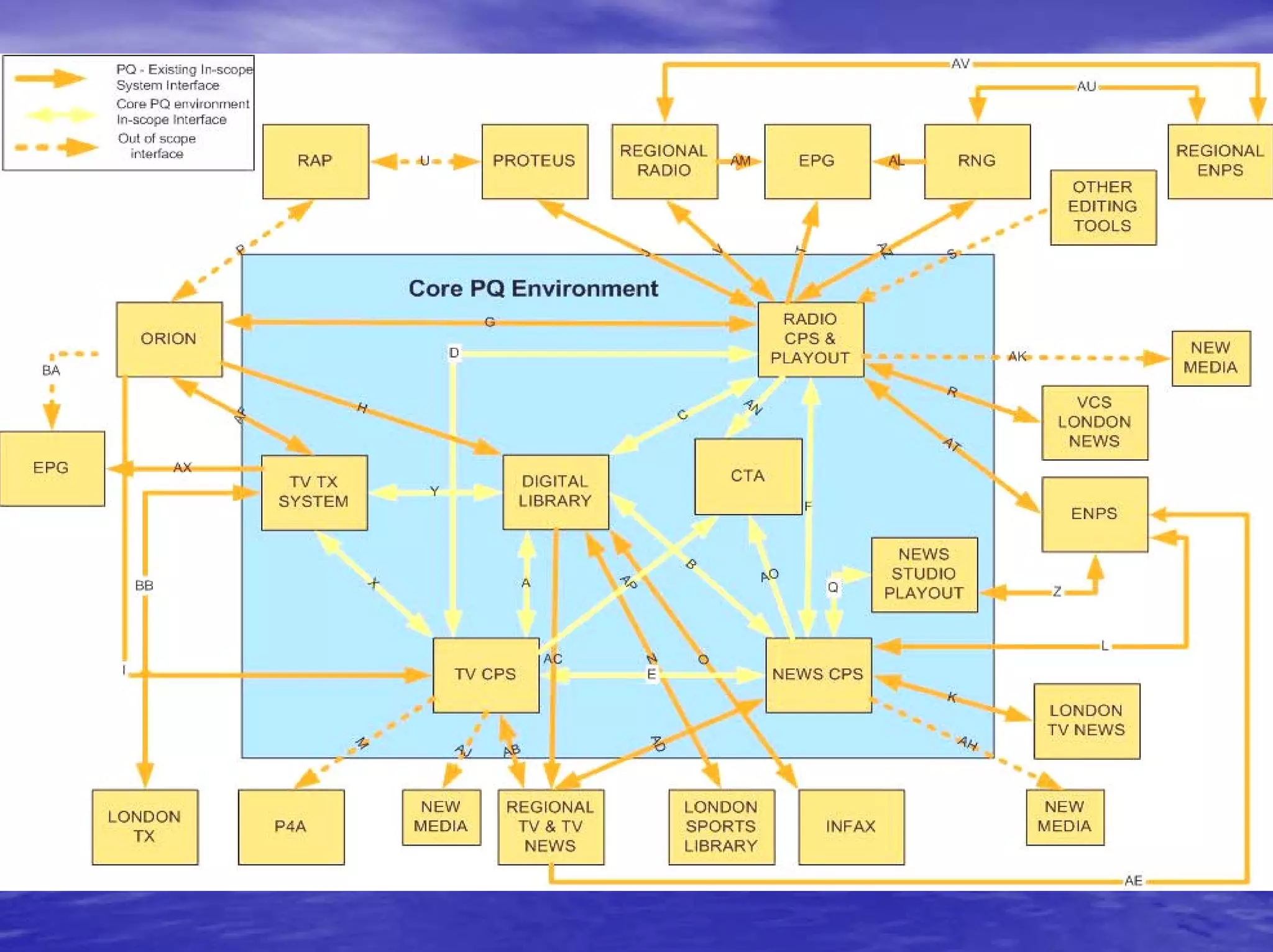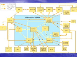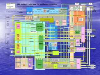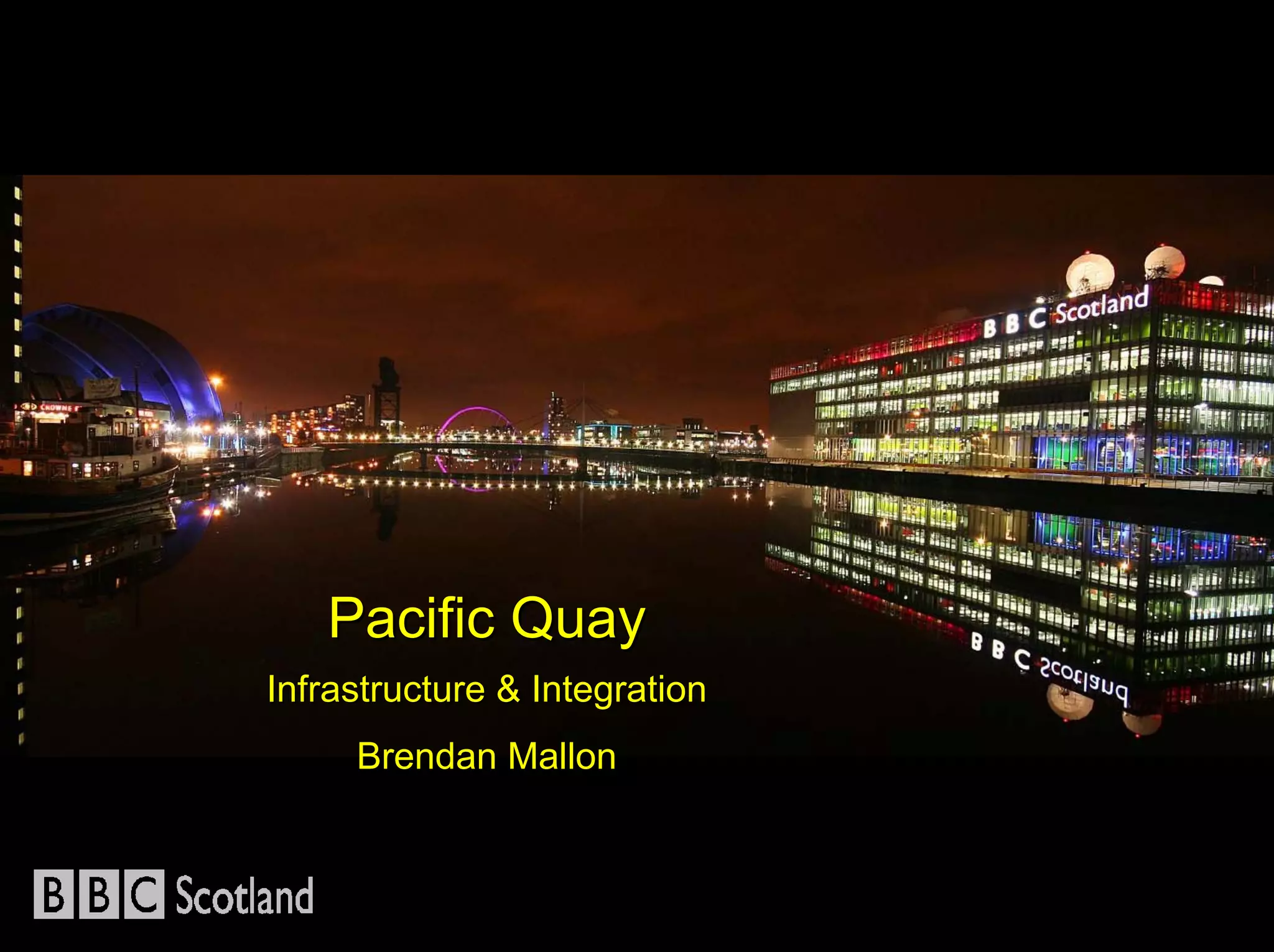 Pacific Quay has a core network with separately routed domains for users, television playout, radio production, post production, and a digital library. The fully converged network uses common hardware and protects core broadcast functions. It has a high bandwidth 40Gbps core with edge access switches connecting 22 hub rooms. Integration of different file formats, codecs, audio formats, metadata, and protocols between real-time and non-real-time systems presents challenges that require mapping schemas and determining if coupling is direct or loose. Questions can be directed to Brendan Mallon.