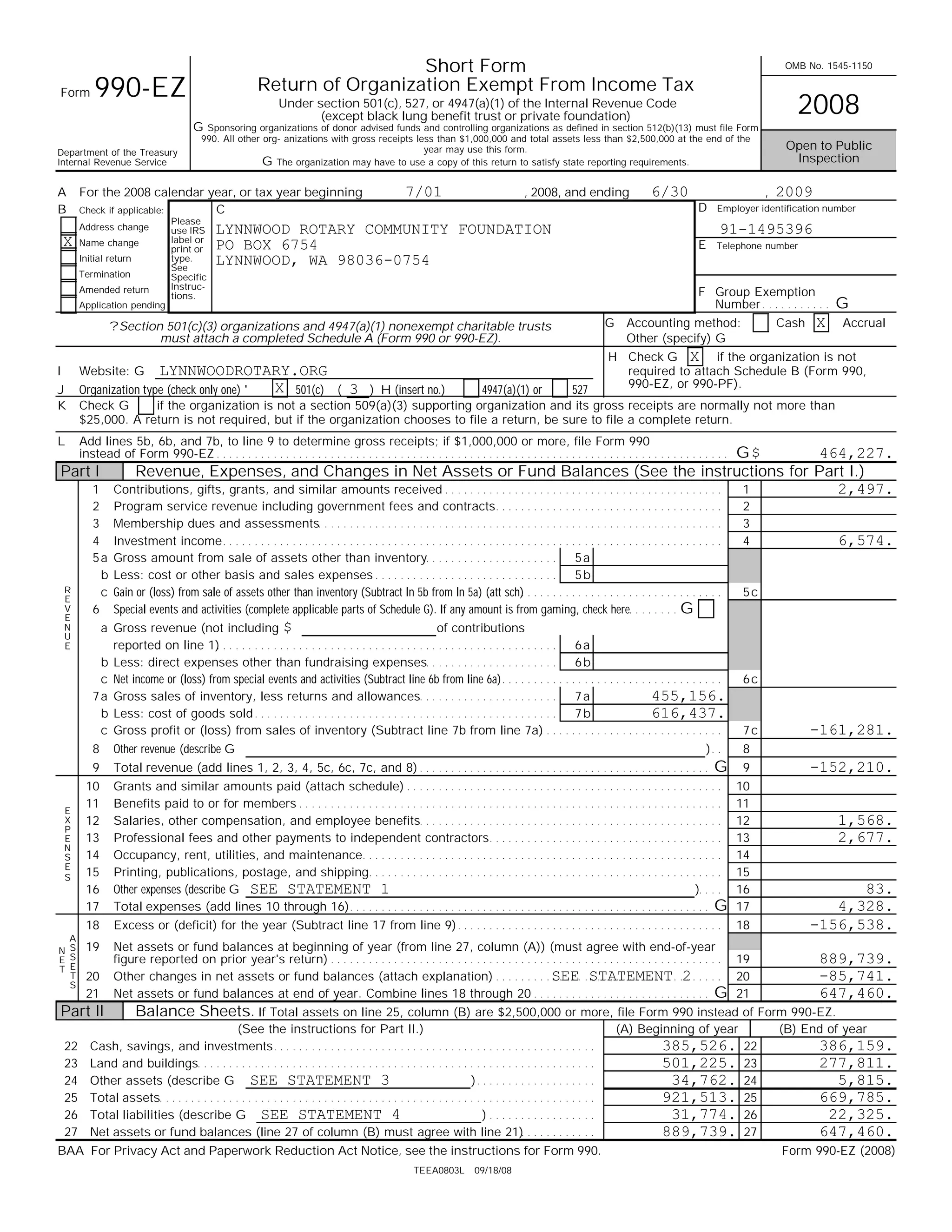 The document is the 2008 Form 990-EZ for the Lynnwood Rotary Community Foundation. It provides a summary of the organization's revenues and expenses for the 2008 tax year. The organization had total revenues of -$152,210 and total expenses of $4,328, resulting in a change in net assets of -$156,538. The organization provides grants to community service organizations to further its exempt purpose of community service.