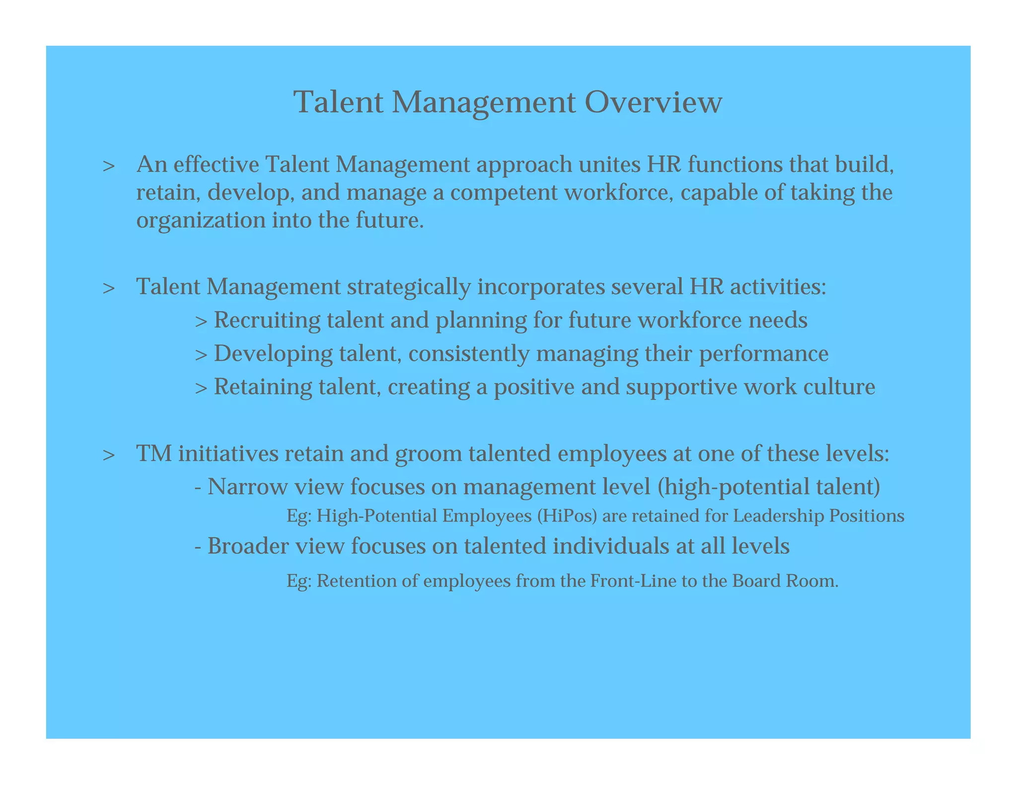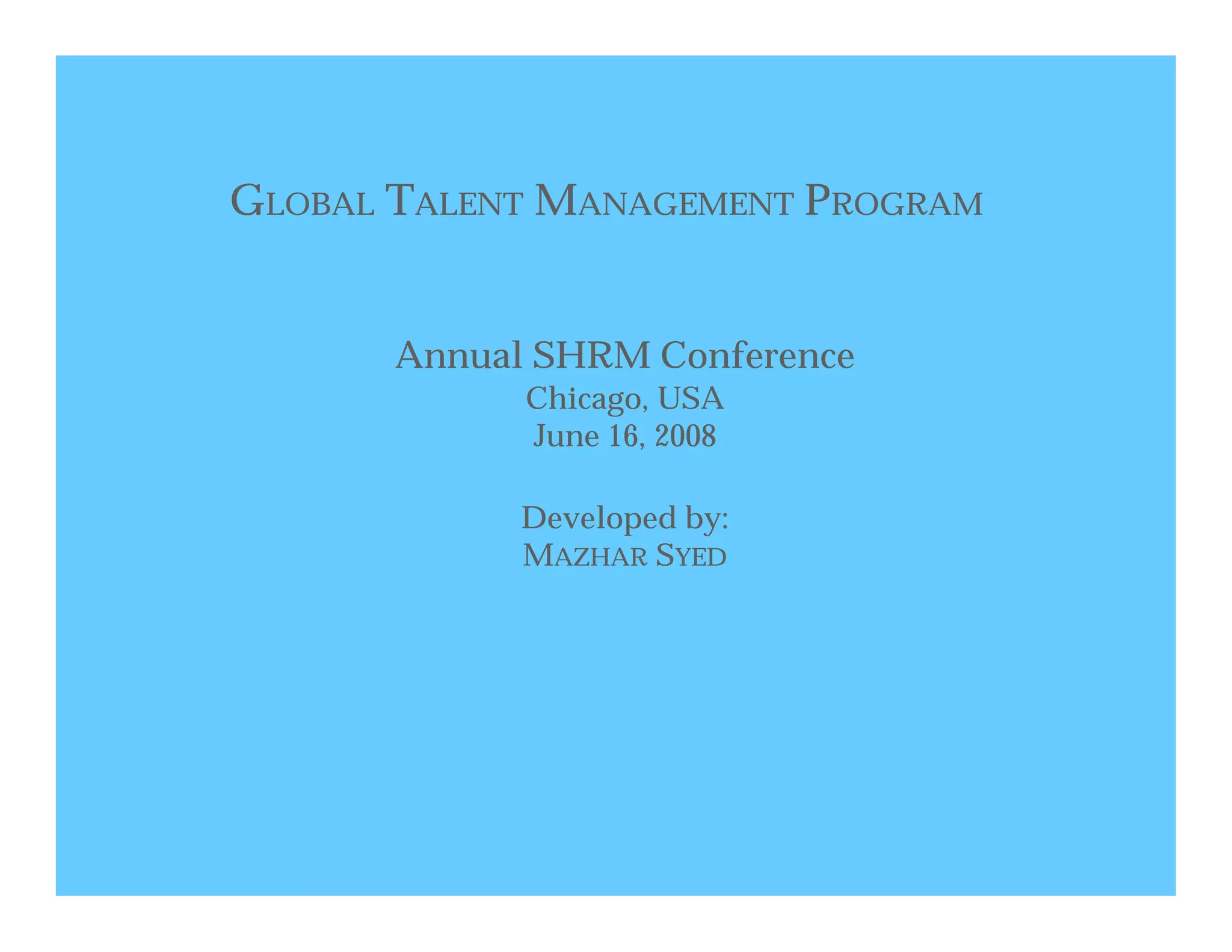 The document outlines the implementation and strategies of a global talent management program, emphasizing the importance of effectively managing HR functions to build and retain a competent workforce. It covers various aspects including recruitment, talent development, performance management, and retention strategies while addressing global challenges and metrics for measuring their effectiveness. Ultimately, it highlights the significance of creating a positive work culture to enhance employee satisfaction and organizational success.