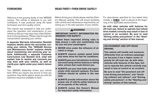 This document is the owner's manual for the 2008 Nissan Pathfinder, containing important information about vehicle operation, maintenance, and safety features. It advises users to read it thoroughly to ensure safe driving practices and familiarity with the vehicle's systems, and warns against modifications that may affect performance and safety. Additionally, it outlines customer care resources for addressing concerns with the vehicle.