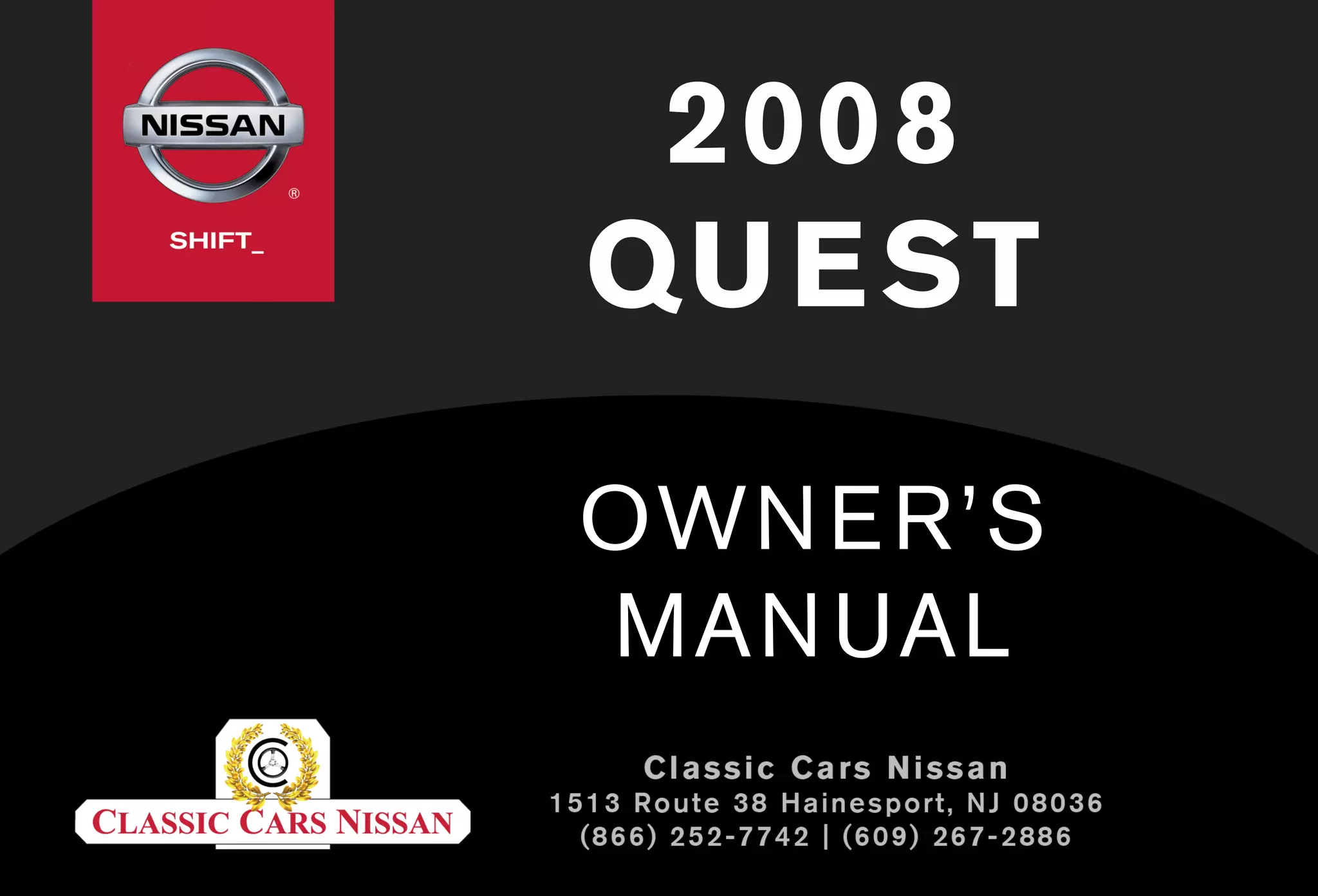 This document is the owner's manual for the 2008 Nissan Quest, providing essential safety and operational guidelines for new vehicle owners. It emphasizes the importance of reading the manual before driving, adhering to safety rules, and not modifying the vehicle, as modifications may lead to safety issues and void warranties. Additionally, it includes information on available warranties, customer care programs, and provides instructions for operating vehicle features and maintenance.