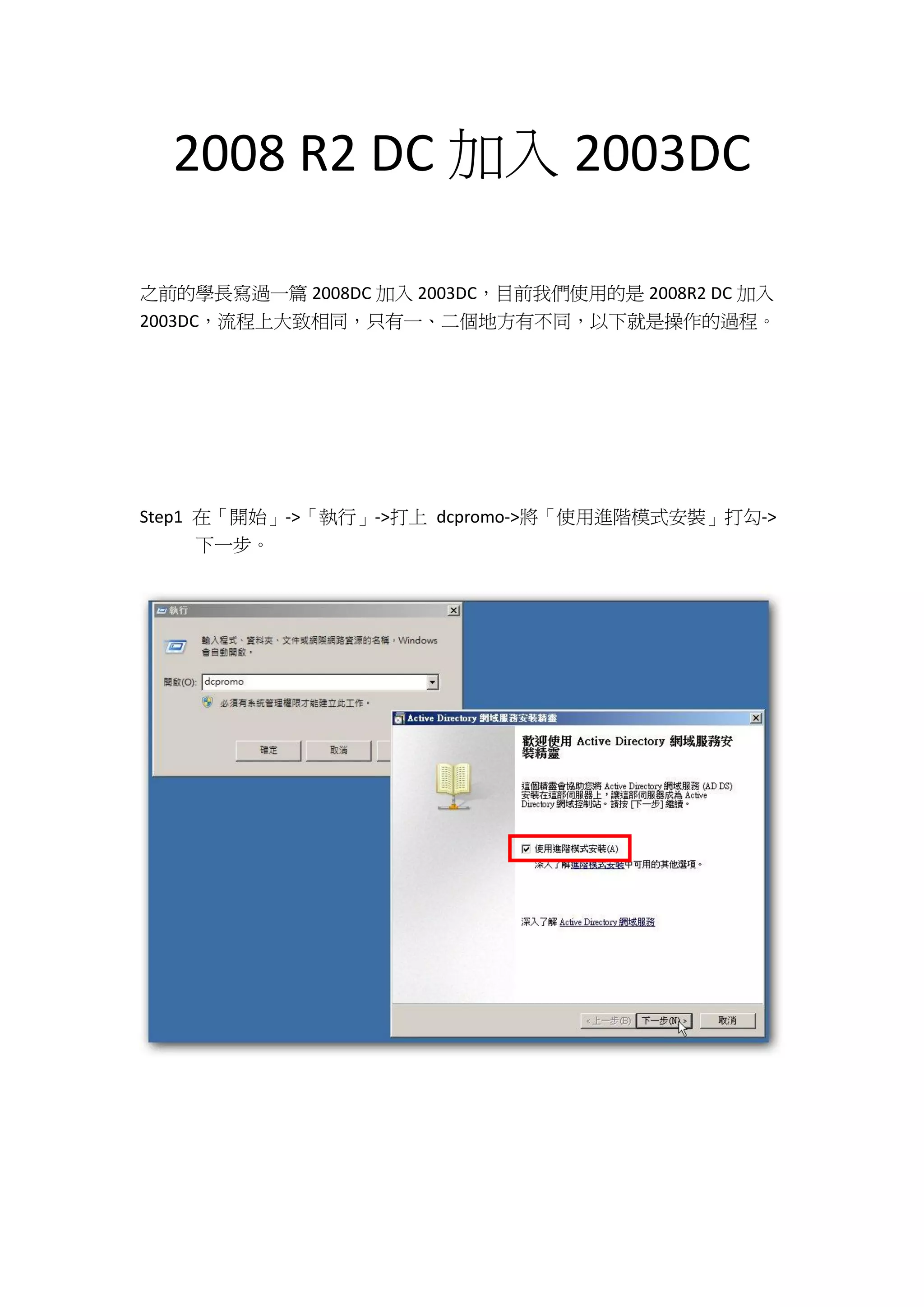 本文档详细描述了将 Windows 2008 R2 域控制器 (DC) 加入到现有的 Windows 2003 DC 的具体步骤。操作过程包括使用 dcpromo 工具、配置网络认证、以及执行多条 adprep 命令以进行域和森林的准备。最终确保成功完成并重启系统以完成整个过程。