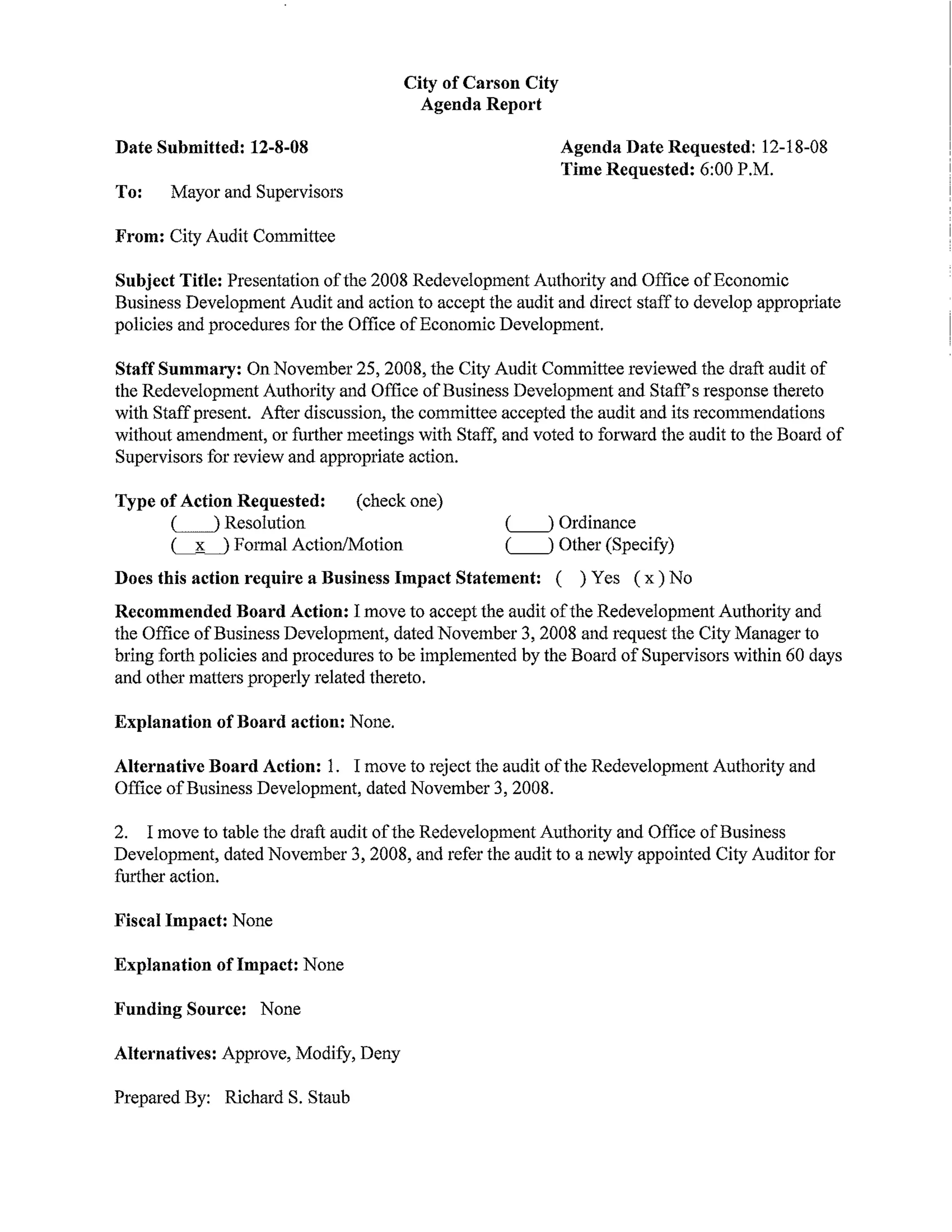 This document summarizes a compliance audit of the Carson City Redevelopment Authority and Office of Business Development. The audit found that the Redevelopment Authority lacked clear policies and procedures, making it difficult to determine if their actions were appropriate. The audit examined expenditures from July 2005 to May 2008 and found deficiencies in oversight of the redevelopment process. Revisions to policies and procedures were recommended to improve accountability.