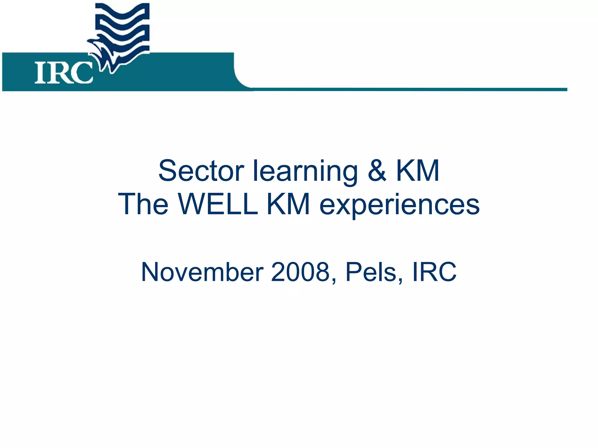 The document discusses knowledge management (KM) workshops conducted by WELL with three organizations - SEUF, AMREF, and IWSD. It summarizes the key outcomes of the workshops:
