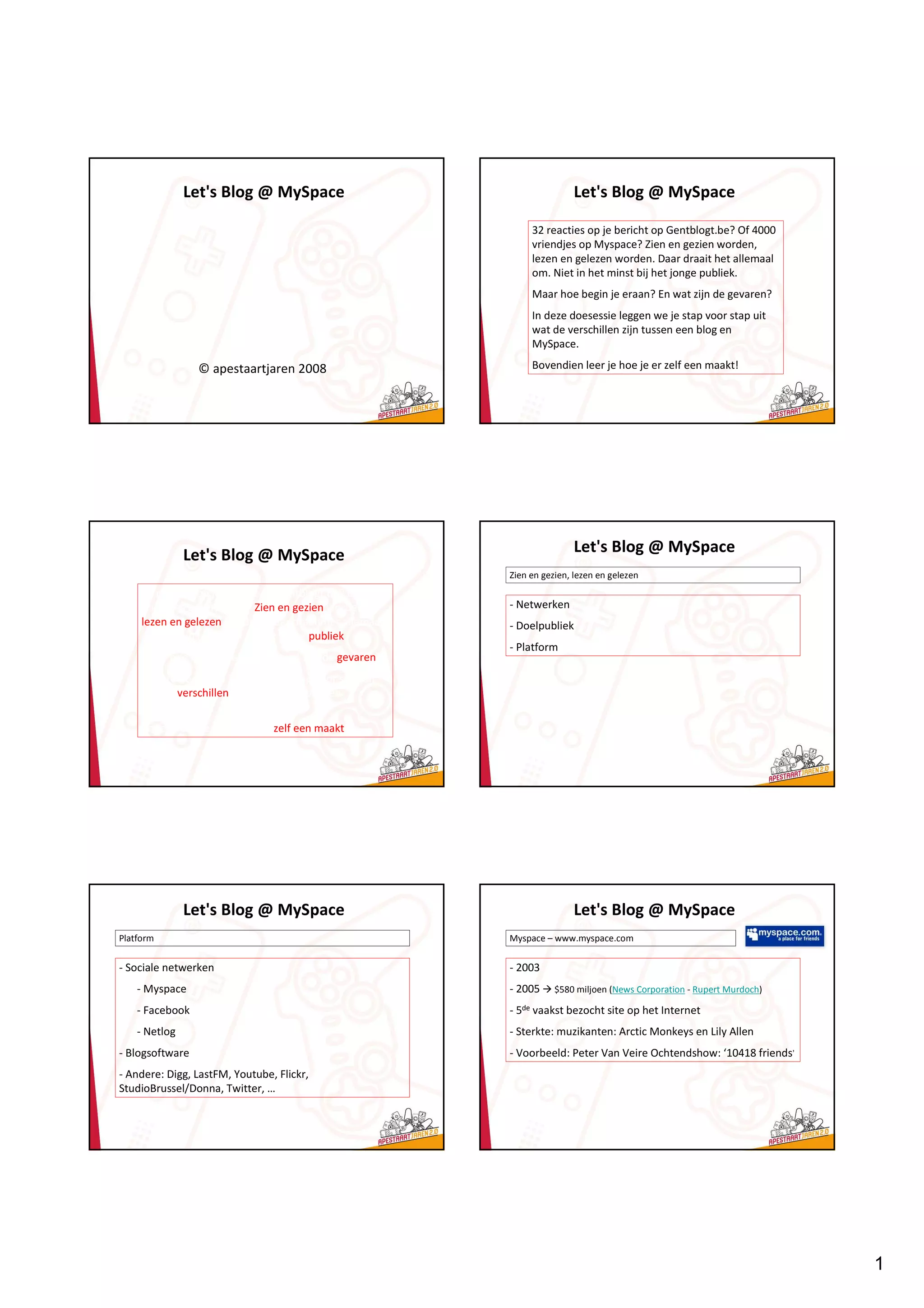 MySpace Let's Blog @ MySpace 32 reacties op je bericht op Gentblogt.be? Of 4000 vriendjes op Myspace? Zien en gezien worden, lezen en gelezen worden. Daar draait het allemaal om. Niet in het minst bij het jonge publiek. Maar hoe begin je eraan? En wat zijn de gevaren? In deze doesessie leggen we je stap voor stap uit wat de verschillen zijn tussen een blog en MySpace. © apestaartjaren 2008 Bovendien leer je hoe je er zelf een maakt! Let's Blog @ MySpace Let's Blog @ MySpace Zien en gezien, lezen en gelezen 32 reacties op je bericht op Gentblogt.be? Of 4000 vriendjes op Myspace? Zien en gezien worden, - Netwerken lezen en gelezen worden. Daar draait het allemaal - Doelpubliek om. Niet in het minst bij het jonge publiek. - Platform Maar hoe begin je eraan? En wat zijn de gevaren? In deze doesessie leggen we je stap voor stap uit wat de verschillen zijn tussen een blog en MySpace. Bovendien leer je hoe je er zelf een maakt! Let's Blog @ MySpace Let's Blog @ MySpace Platform Myspace – www.myspace.com - Sociale netwerken - 2003 - Myspace - 2005 $580 miljoen (News Corporation - Rupert Murdoch) - Facebook - 5de vaakst bezocht site op het Internet - Netlog - Sterkte: muzikanten: Arctic Monkeys en Lily Allen - Blogsoftware - Voorbeeld: Peter Van Veire Ochtendshow: ‘10418 friends’ - Andere: Digg, LastFM, Youtube, Flickr, StudioBrussel/Donna, Twitter, … 1
