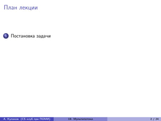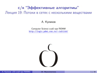 Лекция рассматривает задачу о потоках в сети с несколькими веществами, охватывая постановку задачи, алгоритмы, а также анализ их оптимальности. Основная цель состоит в нахождении множества путей для пар истоков-стоков с минимизацией максимальной ширины рёбер. Лекция также затрагивает методы линейного программирования и переход к целочисленным потокам.