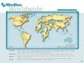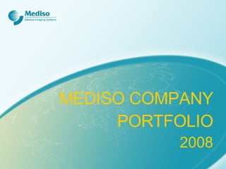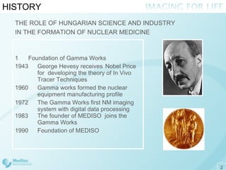 The document outlines the history and development of Mediso, a company specializing in nuclear medicine and imaging technologies, including various gamma camera systems and hybrid imaging solutions. It details significant milestones from its foundation in 1990 through 2008, highlighting innovations like the production of the first Mediso gamma camera and advancements in preclinical imaging systems. Additionally, it describes the extensive product line, including the Nucline™ gamma camera family and other imaging technologies, as well as Mediso's global sales presence and service network.