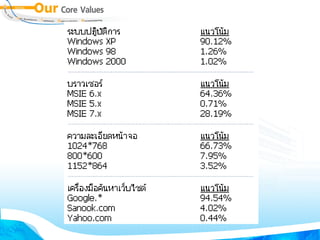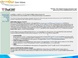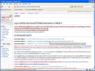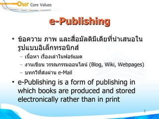 20080620 E Publishing 1. 2. e-Publishing ข้อความ ภาพ และสื่อมัลติมีเดียที่นำเสนอในรูปแบบอิเล็กทรอนิกส์ เนื้อหา เรื่องเล่าในฟอร์แมต งานเขียน วรรณกรรมออนไลน์ (Blog, Wiki, Webpages) บทกวีที่ส่งผ่าน e-Mail e-Publishing is a form of publishing in which books are produced and stored electronically rather than in print 3. e - Publishing กระบวนการผลิตสร้างสรรค์สิ่งพิมพ์ในรูปแบบอิเล็กทรอนิกส์ รูปแบบ ( Formatted) การเข้ารหัส ( Encrypted) การป้องกันความปลอดภัย (Security) การเผยแพร่ (Published) 4. ประโยชน์ของ e - Publishing ลดการใช้กระดาษ , พลังงาน , สิ่งแวดล้อม , ธรรมชาติ ง่ายต่อการปรับปรุงแก้ไข ได้เอกสารที่มีคุณค่า ด้วยกรรมวิธีที่รวดเร็ว เช่น Video Clips ได้เอกสารที่สามารถโต้ตอบกับผู้อ่านได้ ง่าย สะดวกต่อการอ่าน ง่ายต่อการสืบค้น มีความคงทน นำเสนอสื่อมัลติมีเดียได้ 5. ประโยชน์ของ e - Publishing สร้างโอกาสให้กับนักเขียนหน้าใหม่ , นักอยากเขียน พัฒนาสื่อความรู้ สร้างโอกาสทางด้านการศึกษา สร้างโอกาสทางธุรกิจ เพิ่มมูลค่าให้กับ e-Library, e-Learning 6. จุดอ่อนของ e - Publishing ลงทุนสูงในขั้นต้น ปัญหาในการอ่าน เช่น ขนาดจอภาพ , ความคมชัด การละเมิดลิขสิทธิ์ ไม่ให้ความสำคัญกับมาตรฐาน เทคโนโลยียังมีการพัฒนาอย่างต่อเนื่อง 7. องค์ประกอบที่เกี่ยวข้องกับ e - Publishing Publishers Conversion Services / Tool Developers Distributors e - Retailers Device Manufactures Software Vendors Reader / User 8. 9. 10. ประเภทของ e - Publishing Free e-Publishing Commercial e-Publishing Pay per View e-Publishing Purchased e-Publishing Leased e-Publishing 11. 12. 13. Software Authoring Converter Reader DNL Reader – Desktop Author FlipViewer – FlipAlbum, FlipPublisher Acrobat Reader – PDF Format TIFF Viewer – TIF Format 14. Content Format Original Format from Word Processor & DTP Palm/PDA (PDB, PML: Peanut Markup Language) Acrobat (PDF: Portable Document Format) Graphics (TIFF format) Multimedia (FlipAlbum, Flash, MP3) Web Documents (HTML, XML: Extensive Markup Language) 15. Word Processor & DTP ฟอนต์มาตรฐาน Style หัวใจหลักในการสร้างผลงาน Layout ดึงดูดความสนใจ อย่าลืมฝังฟอนต์ (Embedded) http :// www . stks . or . th / web / index2 . php?option = com_docman&task = doc_view&gid = 334&Itemid = 31 16. Palm/PDA Word Processor ---convert--> PDB PDF for Palm/PDA Specific Creator http :// www . thaiebook . org / t0103 / index . php?pgid = &PHPSESSID = a2958f6f27808d363d7024fd952c4ca2 17. 18. PDF การฝังฟอนต์ สารบัญ / Bookmark ระบบรักษาความปลอดภัย http :// www . stks . or . th / web / index2 . php?option = com_docman&task = doc_view&gid = 578&Itemid = 31 19. 20. 21. 22. 23. ขนาด e- Publishing Offline เต็มจอภาพ ระบุขนาดให้ชัดเจน เช่น 800 x 600 หรือ 1024 x 768 pixels Online ไม่เต็มจอภาพ ขึ้นอยู่กับ Layout ของเว็บไซต์ ตัวอย่างเช่น 700 x 440 หรือ 900 x 550 pixels 24. 25. Server & Client WindowsXP IE Windows2000 IE Macintosh Windows98 Netscape พัฒนาเว็บด้วย HTML Editor, HTML Generator บน Windows Server : Unix/NT upload 26. 27. ตัวอย่าง การ ตั้งชื่อ สื่อนำเสนอด้วย Microsoft PowerPoint ตั้งชื่อแฟ้มเอกสารในฟอร์แมต yyyymmdd-filename.ppt โดย yyyy คือปี ค . ศ . mm คือตัวเลขเดือน dd คือเลขวัน ภาษาอังกฤษ ผสมตัวเลข ห้ามเว้นวรรค ใช้ได้เฉพาะเครื่องหมาย – 28. การเตรียมสื่อนำเสนอด้วย Microsoft PowerPoint สร้างสื่อนำเสนอเรื่องดอกบัว โดยสร้างวันที่ 10 ม กรา คม 2553 ให้ตั้งชื่อแฟ้มเอกสารเป็น 20100110-lotus.ppt 2553 มกราคม 10 ดอกบัว 2010 01 10 lotus 29. ไฟล์ประกอบ Image .gif .jpg .bmp Video .avi .wmv Sound/Audio .wav .mp3 Flash Movie .swf PDF .pdf Original Documents .doc .xls .ppt 30. 31. 32. TIS-620/Windows-874 ประเทศไทยมีมาตรฐานอักขระซึ่งกำหนดโดย สำนักงานม