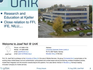 The document discusses various factors that influence privacy such as cultural sensitivity, personal dignity, and safety concerns. It examines different types of privacy including physical, informational, and organizational privacy. Additionally, it explores related concepts like identity, reputation, and trust in the digital world and how information about individuals is exposed through electronic traces online.