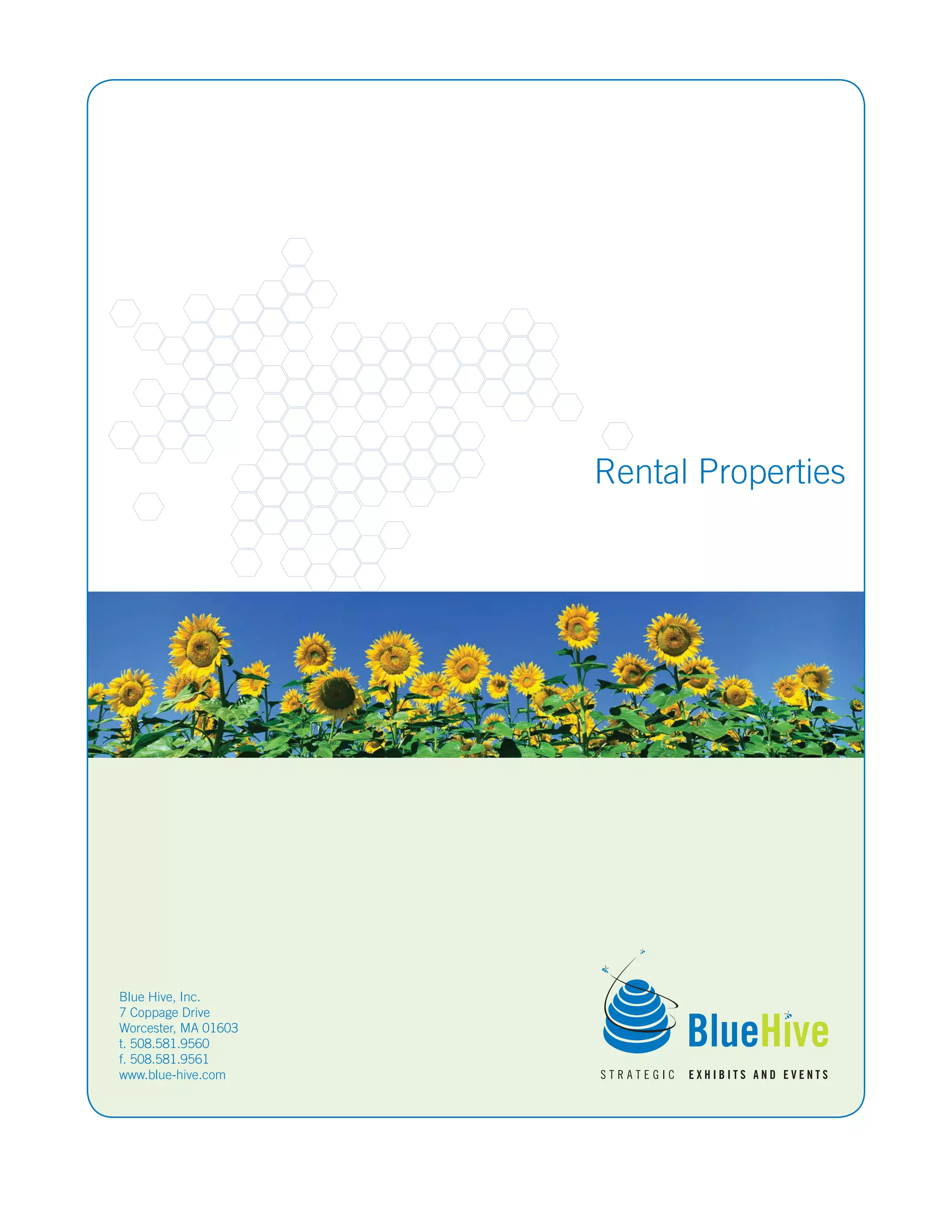 Blue Hive, Inc. provides rental properties for international exhibits including custom island and linear rental exhibits of various sizes from 5m x 7m to 20m x 40m with features like theater presentation areas, plasma displays, storage areas, conference rooms, and programmable lighting. The company emphasizes developing client trust by exceeding expectations with innovative design ideas that challenge conventions.
