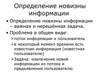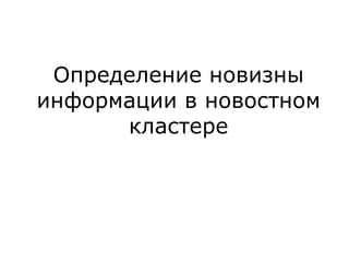 Документ обсуждает определение новизны информации в новостном кластере и сложности, связанные с извлечением новой информации из потока документов. Он описывает задачи и подходы, используемые в конференции TREC для оценки релевантности и новизны предложений в новостных текстах, а также результаты экспериментов с различными методами и системами. Акцентируется внимание на необходимости доработки векторно-пространственной модели для более эффективного обнаружения новых идей и информации.