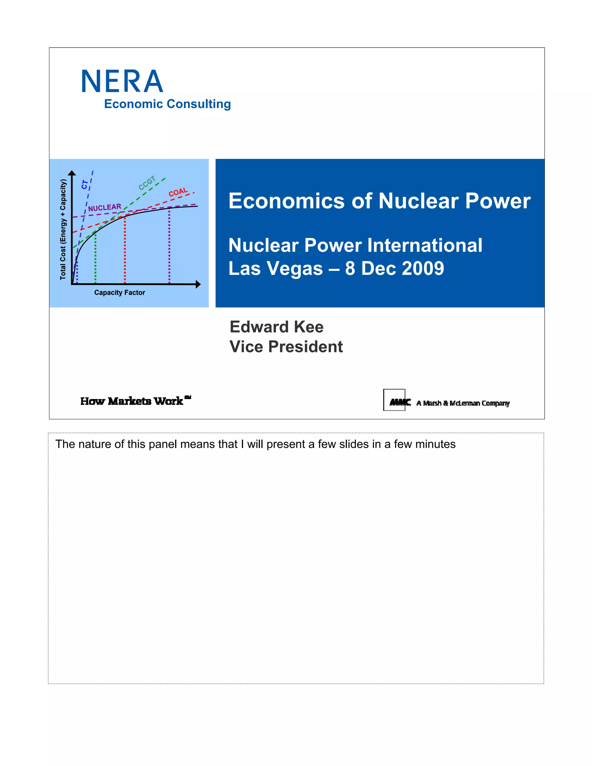 Existing nuclear power plants are valuable resources that provide zero-carbon, low-cost energy. However, building new nuclear power plants faces challenges due to high capital costs, long construction timelines, and regulatory hurdles. The first new nuclear power plants will test regulatory and project development processes and help reduce risks and costs for future plants. Government support through policies like loan guarantees may be needed to encourage investment in new nuclear energy.