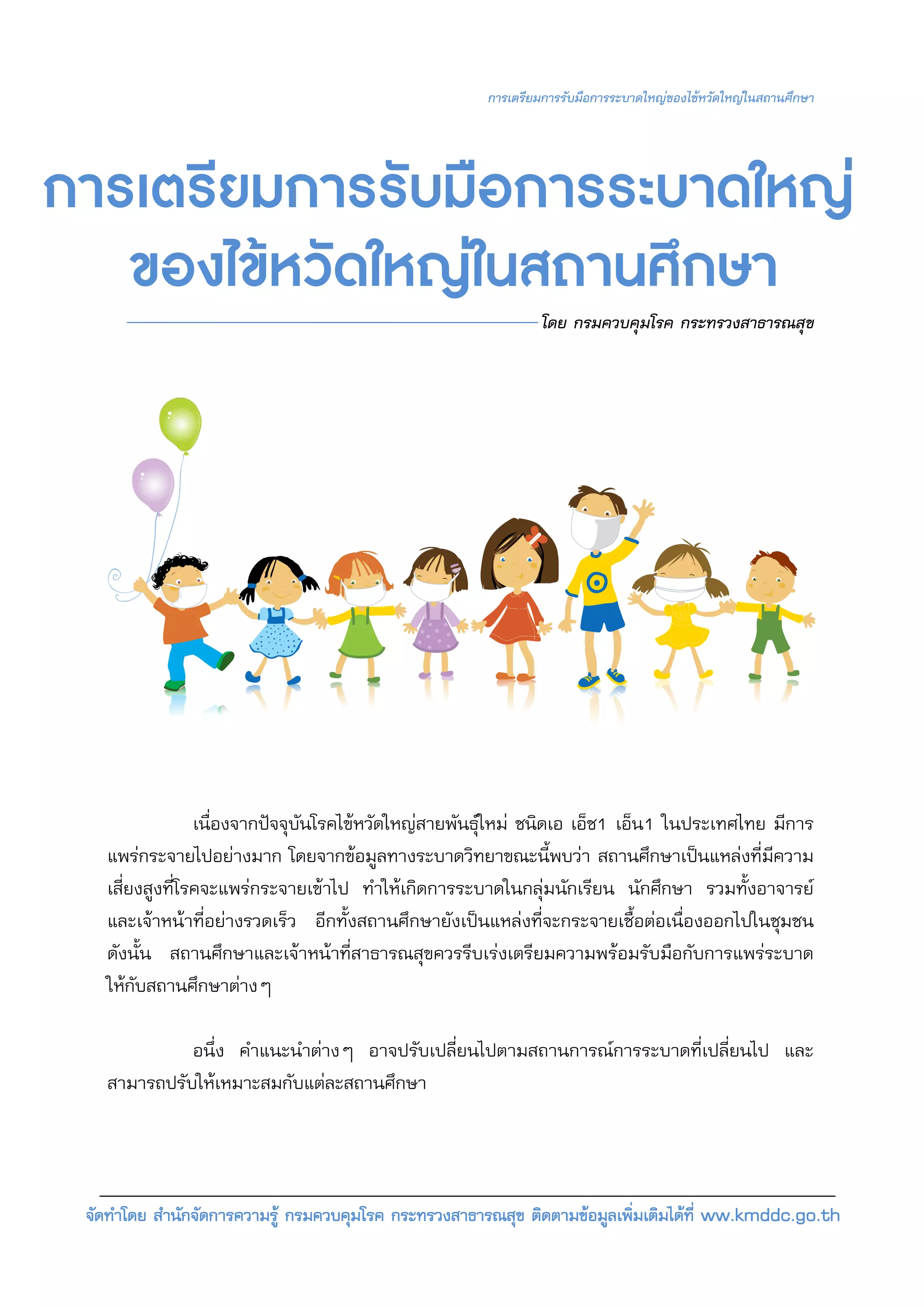 ของไขหวัดใหญในสถานศึกษา โดย กรมควบคุมโรค กระทรวงสาธารณสุข เนื่องจากปจจุบันโรคไขหวัดใหญสายพันธุใหม ชนิดเอ เอ็ช1 เอ็น1 ในประเทศไทย มีการ แพรกระจายไปอยางมาก โดยจากขอมูลทางระบาดวิทยาขณะนี้พบวา สถานศึกษาเปนแหลงที่มีความ เสี่ยงสูงที่โรคจะแพรกระจายเขาไป ทําใหเกิดการระบาดในกลุมนักเรียน นักศึกษา รวมทั้งอาจารย และเจาหนาที่อยางรวดเร็ว อีกทั้งสถานศึกษายังเปนแหลงที่จะกระจายเชื้อตอเนื่องออกไปในชุมชน ดังนั้น สถานศึกษาและเจาหนาที่สาธารณสุขควรรีบเรงเตรียมความพรอมรับมือกับการแพรระบาด ใหกับสถานศึกษาตางๆ อนึ่ง คําแนะนําตางๆ อาจปรับเปลี่ยนไปตามสถานการณการระบาดที่เปลี่ยนไป และ สามารถปรับใหเหมาะสมกับแตละสถานศึกษา จัดทําโดย สํานักจัดการความรู กรมควบคุมโรค กระทรวงสาธารณสุข ติดตามขอมูลเพิ่มเติมไดที่ ww.kmddc.go.th